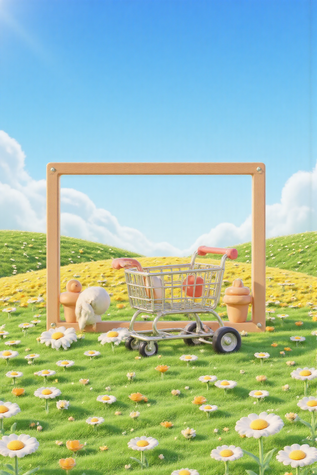 3D carton style,E-commerce photography, minimalism, large areas of negative space, spring background, in a meadow, garden, cloudless blue sky, fresh colors, clear structure, masterful composition.