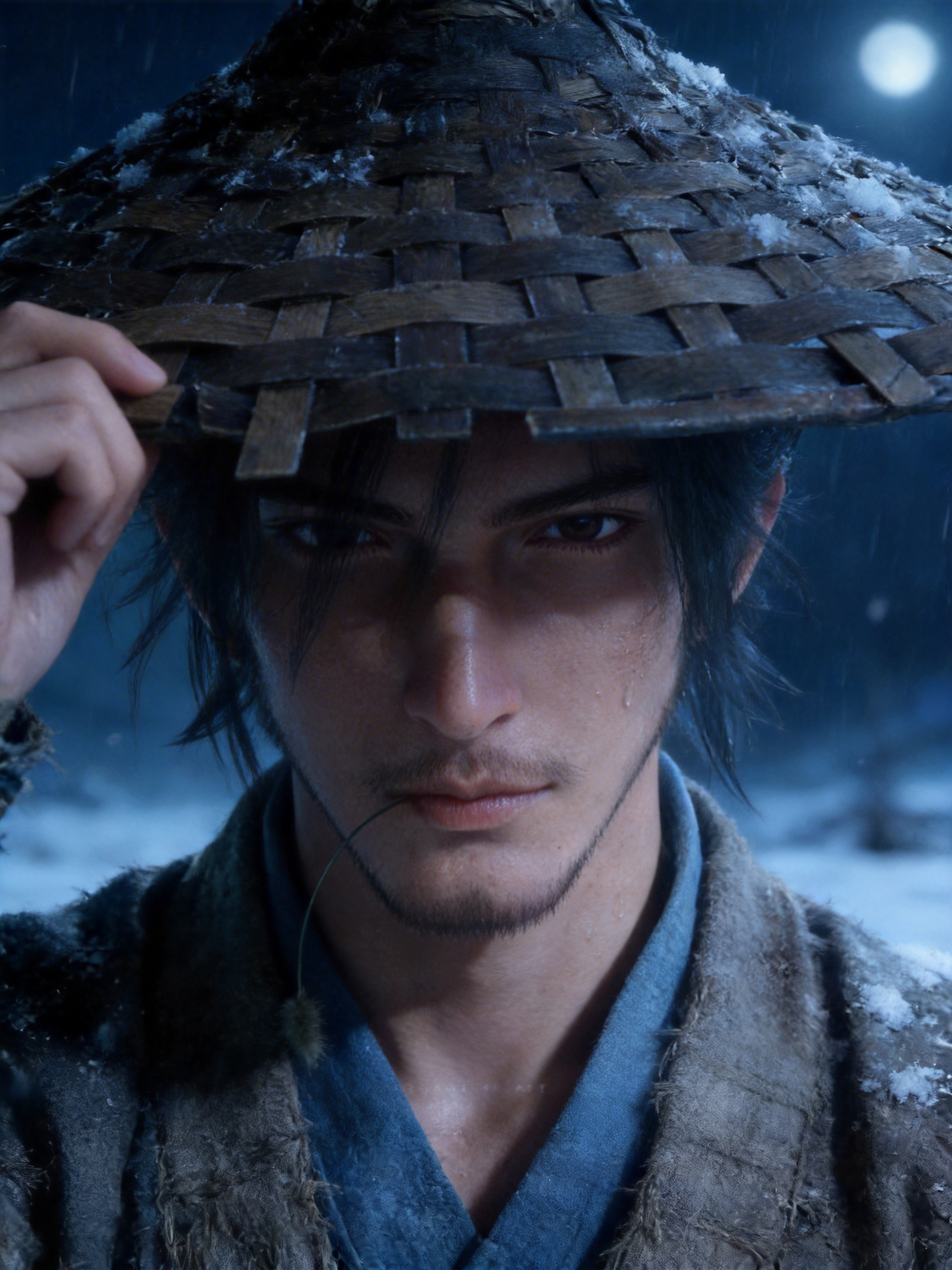 次时代CG角色渲染。国风仙侠男性侠客角色,黑发微乱,头戴深色竹编斗笠,身着灰褐粗布外衫与内搭蓝衫;姿态为单手轻扶斗笠檐,眼神沉静锐利,雪花飘落;背景是暗蓝朦胧的雨夜 / 雪夜,氛围江湖孤寂、清冷神秘;镜头为近景特写,正面偏侧角度,冷调弱光,斗笠与布料质感质朴粗糙。