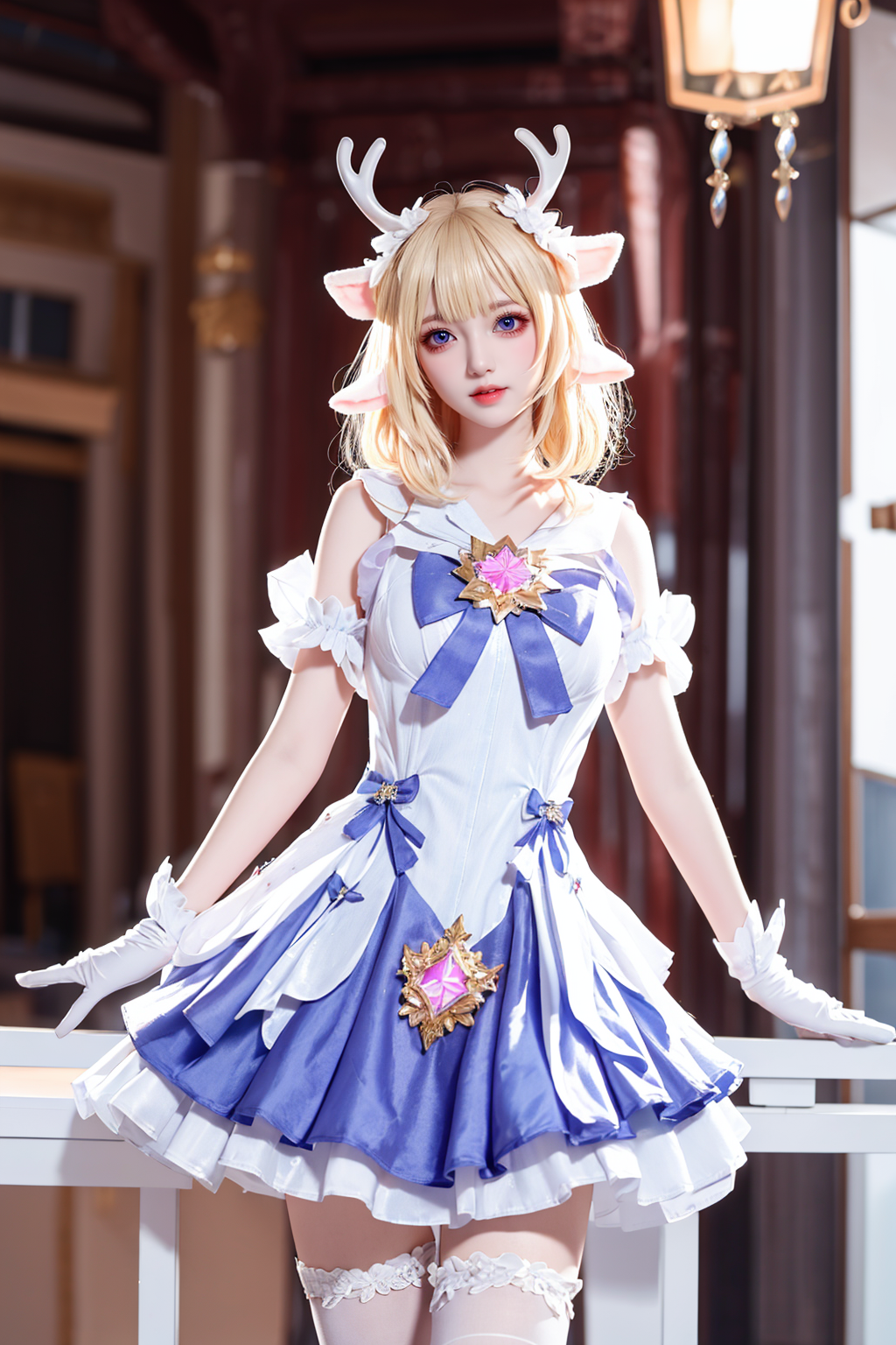 ((Very detailed CG)),1girl,masterpiece,exquisite CG rendering,(high detail skin:1),smooth skin,super high resolution,sparkling eyes,perfect body,feminine body,refined facial features,<lora:Better light光线效果:0.5>,gloves, white_gloves, dress, white_legwear, solo, blonde_hair,antlers.> <lora:yao_v1:0.65>.