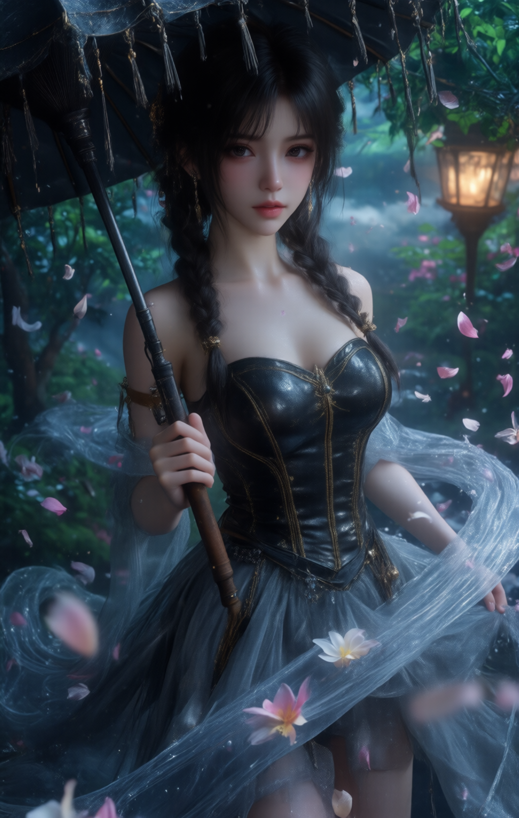 Colorshow,DTOC,game cg,超现实3D渲染,优雅的年轻女子双马尾辫,黑色无肩带紧身连衣裙,金色缝线,深灰色飘逸薄纱裙,手持黑色流苏雨伞,优雅地提起裙子,镶嵌在梦幻的暮色花园,飘落的粉色/白色花瓣,漩涡状的薄雾,郁郁葱葱的深绿色树叶,远处发光的灯笼,电影照明,浪漫空灵的气氛,8k超详细的纹理,