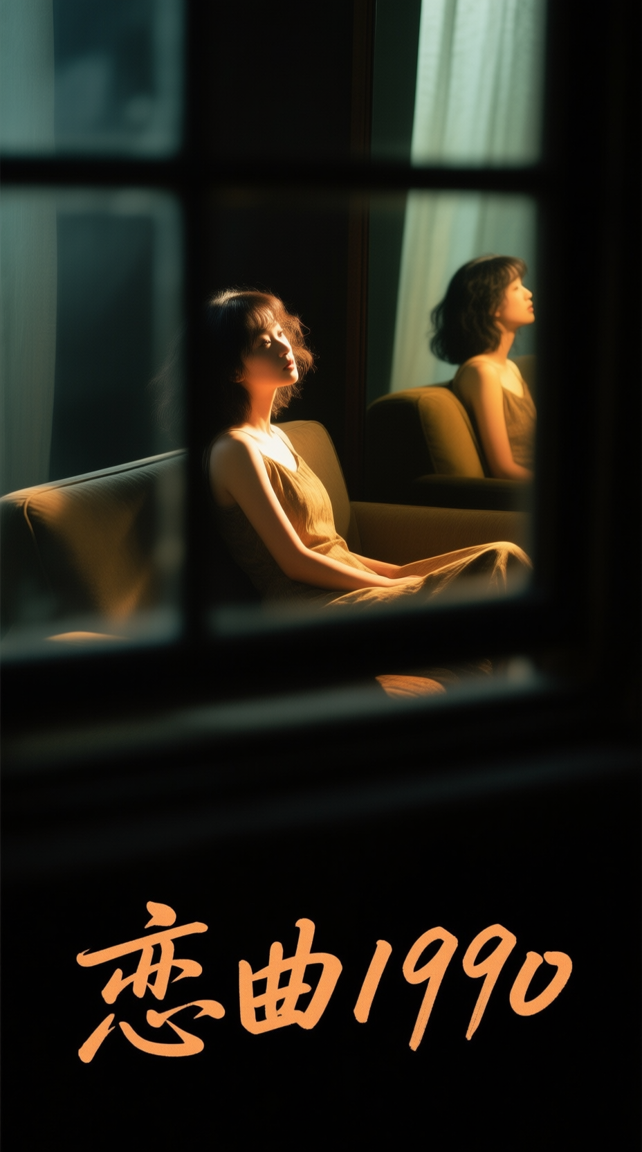 色彩光影完美结合,伦勃朗光,逆光拍摄主角,主角主光侧加一道强光,辅助塑造人物形象,增强画面质感,营造氛围,光反差给人以强烈的视觉冲击,前景遮挡(景窗),blurry_foreground,偷窥的第三视觉,留白+弱光 (绝大部分的画面掩藏在黑暗中,只有一小部分明亮区),镜子映射,反射,折射,虚实结合,局部超微矩镜头,强化视觉效果,突出动作细节,表达含蓄,紧张感,过朦,overexposure,高曝,曝朦,弥散模糊晕染,dreamlike,王家卫风格,深景,环境暗调,色彩反差,高饱和,高清,32K,画面简洁,焦点突出,高级感,即视感,叙事感,怀旧,双重曝光,慢门,梦幻柔美,低调摄影,以黑金,青橙为主色,大师级作品,画面:一个女生慵懒懒散的坐在沙发里,少女回眸,惊艳的容貌,蓬松刘海,东方美女,图像下方有手写的书法风格“恋曲1990”