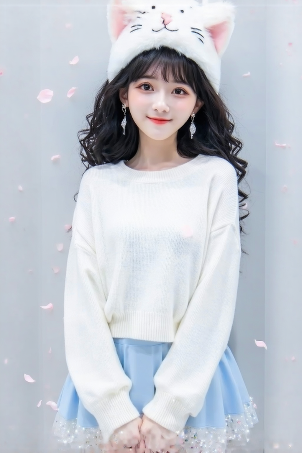 A cute and charming girl wears a soft and fluffy Cat's ears (Steamed cat-ear shaped bread) headdress on her head. The inside of the cat ear is light pink, and the tip of the ear is white. Her face is delicate and small, her skin is fair and rosy, her eyes are deep and clear like lake water, and her eyelashes are long and curly. Her black and shiny hair draped over her shoulders, with a few strands resting on her cheeks. She was wearing a loose white sweater with a slightly open neckline revealing a slender neck. The sweater had snowflake like patterns and was paired with a light blue short skirt with lace trim. Her lips were like rose petals, slightly pouting with a smile, and she had silver earrings hanging from her ears.