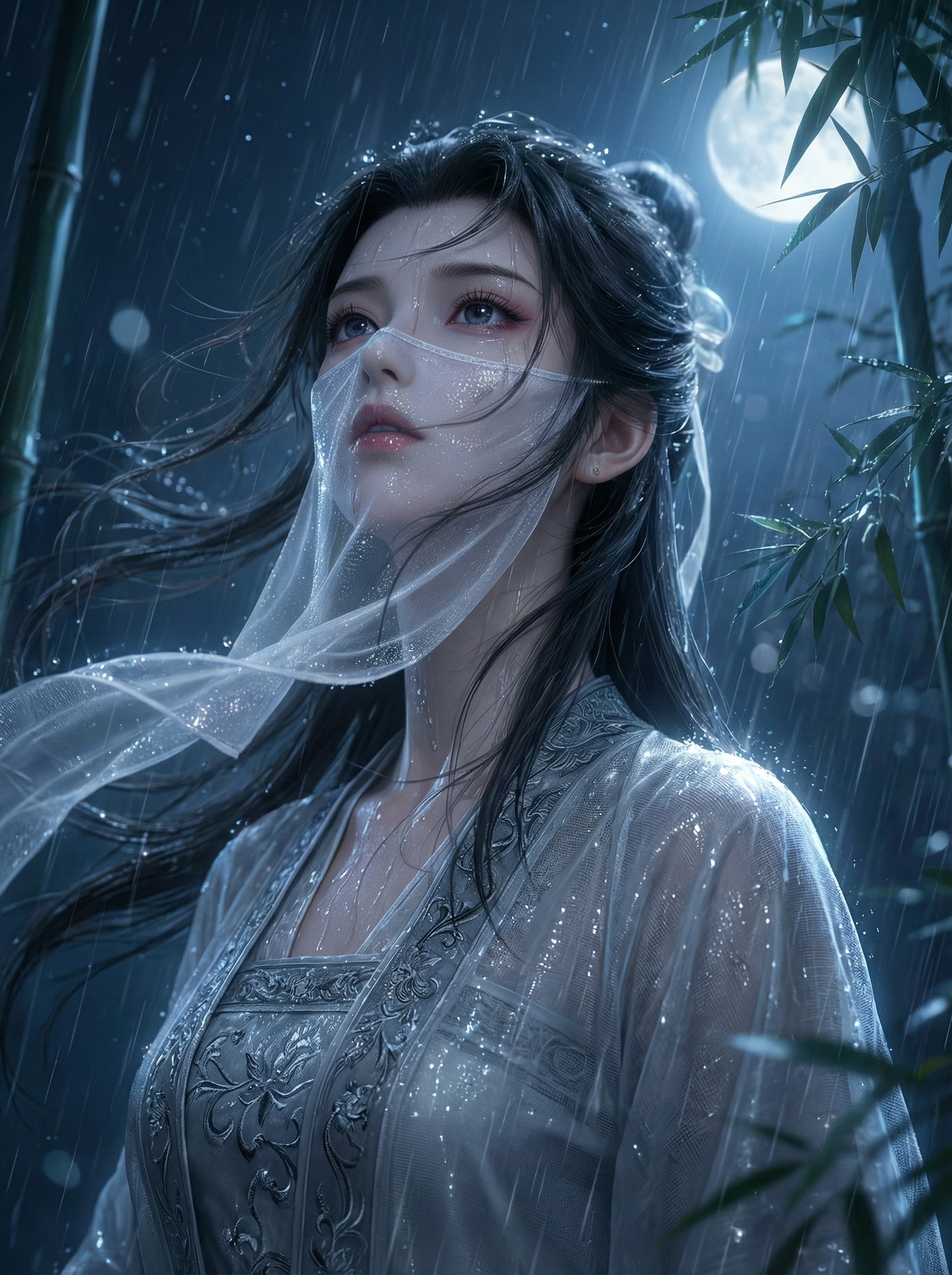 3D次时代CG角色渲染。汉服少女,身着浅灰纱质汉服,衣料带暗纹;在月光下的竹林仰头望雨,发丝与面纱随风飘动;背景是雨夜星空,冷调幽蓝,氛围清冷仙气、唯美哀愁;镜头为近景特写,雨丝与光斑营造梦幻感。