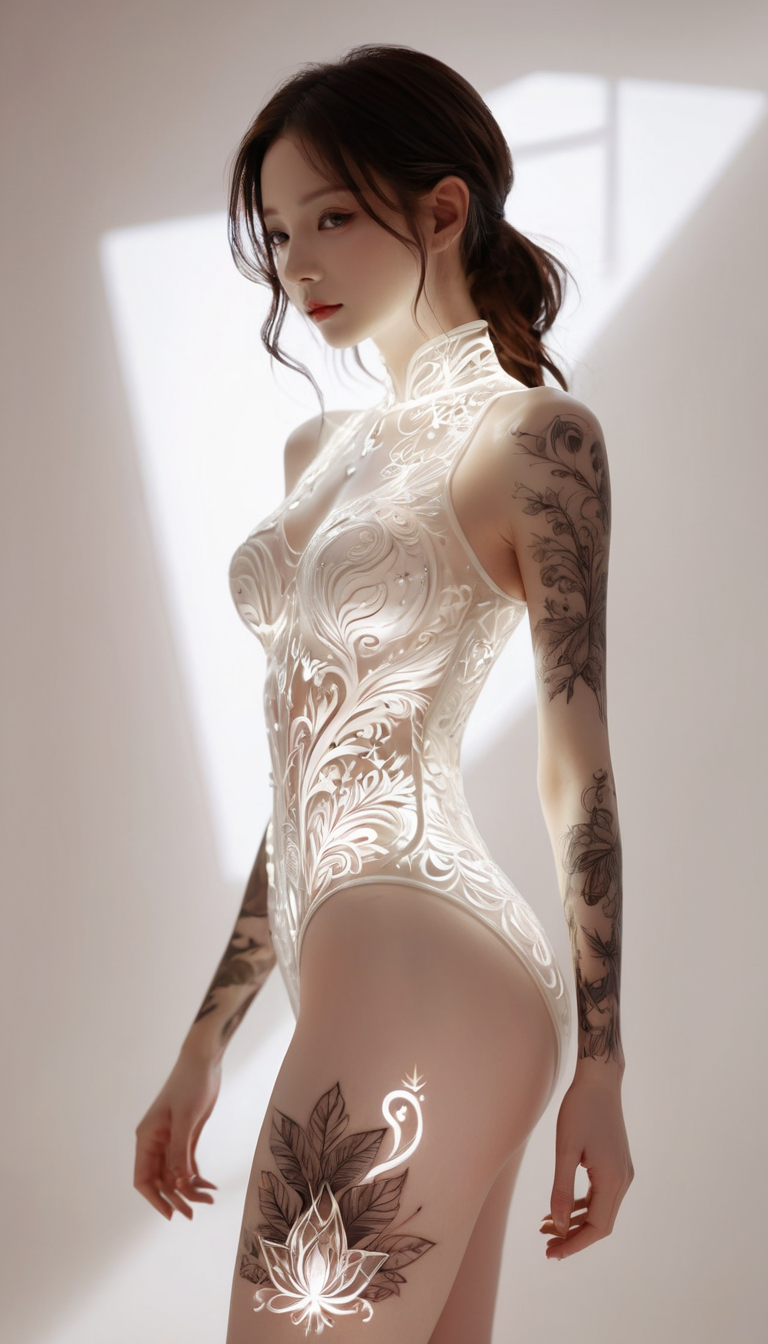 [hdr:0.9],Acid Graphics,plant 1girl,fantasy artwork,[detailed Vibrant face:0.33],[coat dress:0.15],[K-pop:0.417],[Upturned buttocks:0.4],masterpiece,(trash-polka tattoos:1.4),(translucent luminous body:1.2),A minimalist design,of a silhouette outline and a beautiful woman and a glowing,shadow world,intricate artwork Masterpiece,((white background1.5)),