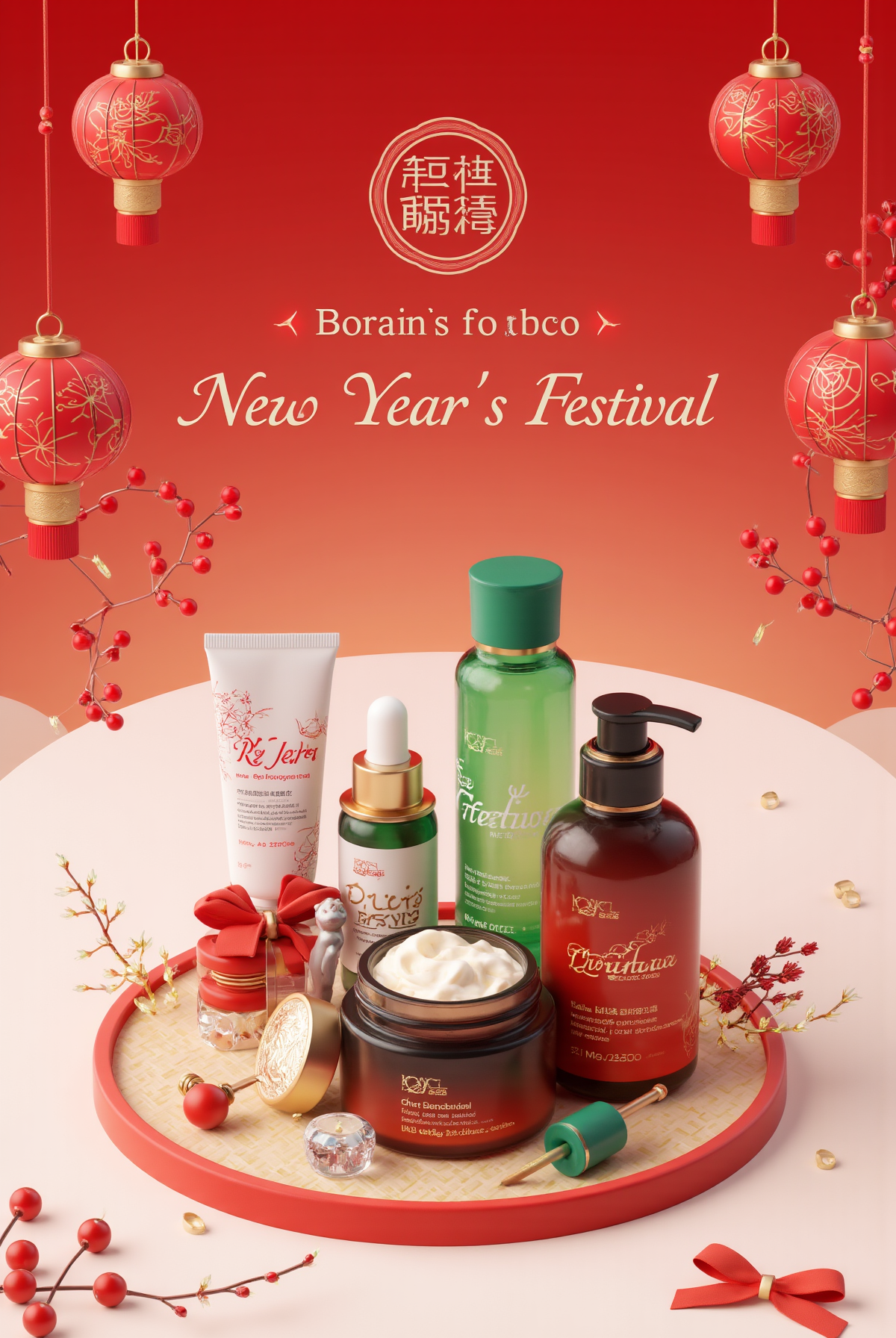 ,Festive New Year's celebration,elegant and clean design,three cosmetic products prominently featured,products arranged stylishly with festive decorations,red lanterns,gold accents,soft lighting,warm atmosphere,simple and sophisticated background,photorealistic style,high-quality details,minimal clutter,modern yet traditional design,elegant typography for 'New Year's Festival' text,