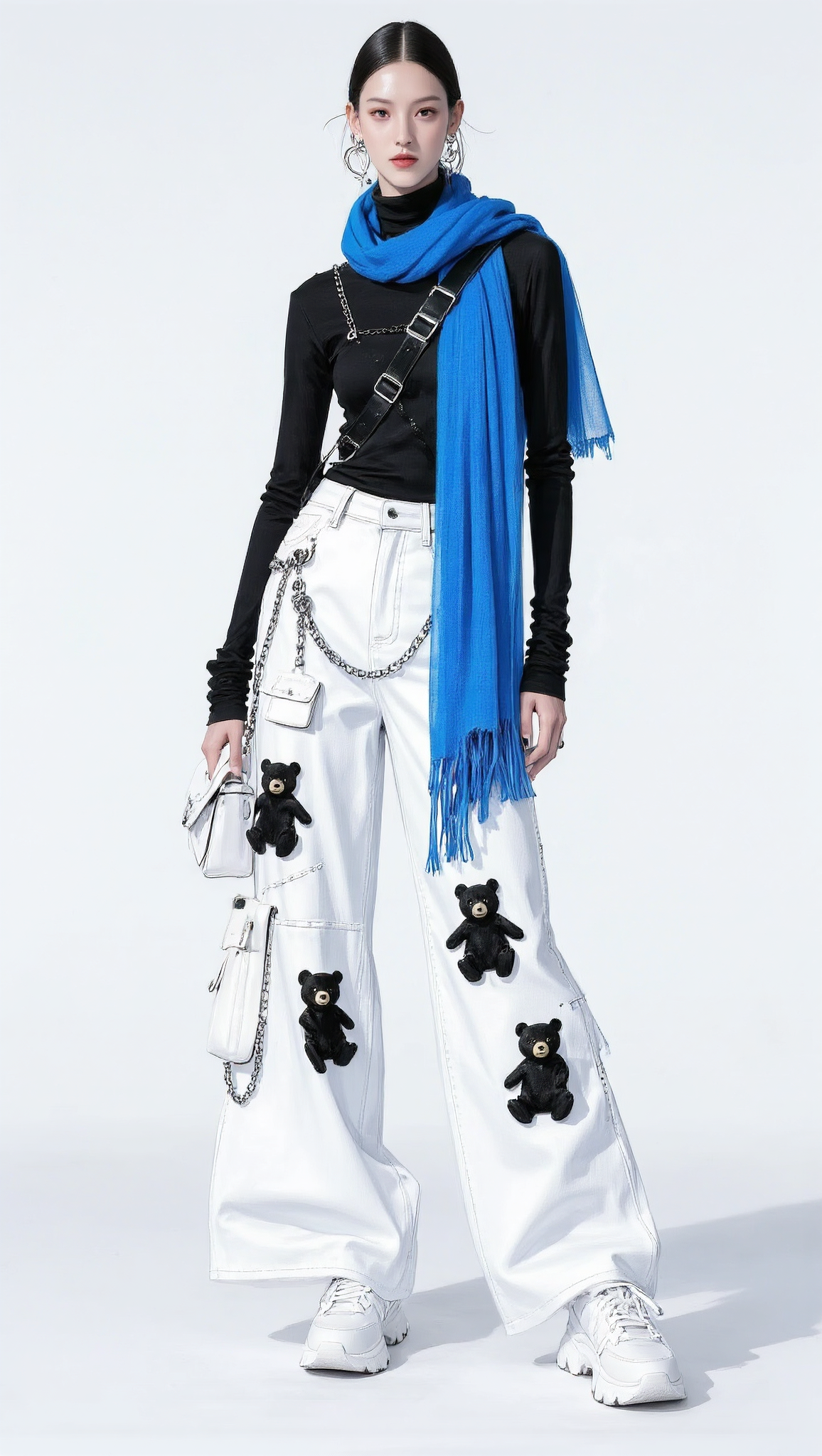 - The person is wearing wide-leg white pants adorned with black bear appliqués on the knees.
