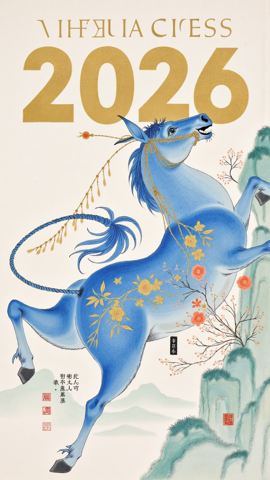 masterpiece,flat illustration poster,album cover,with huge bold golden title text "2026",with abstract graphic of horse,masterpiece,with some text and pattern decorated,luxurious,with highly detailed,with blue color,