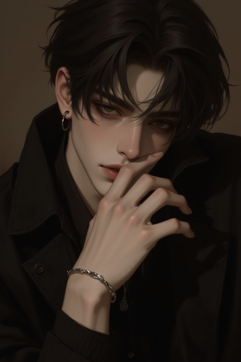 This is a digital painting of a pale-skinned, androgynous young person with tousled black hair, wearing dark makeup and heavy eyeliner. They have small, black hoop earrings and a black jacket. Their fingers are touching their lips, with a silver bracelet on their wrist. The background is a muted, dark brown