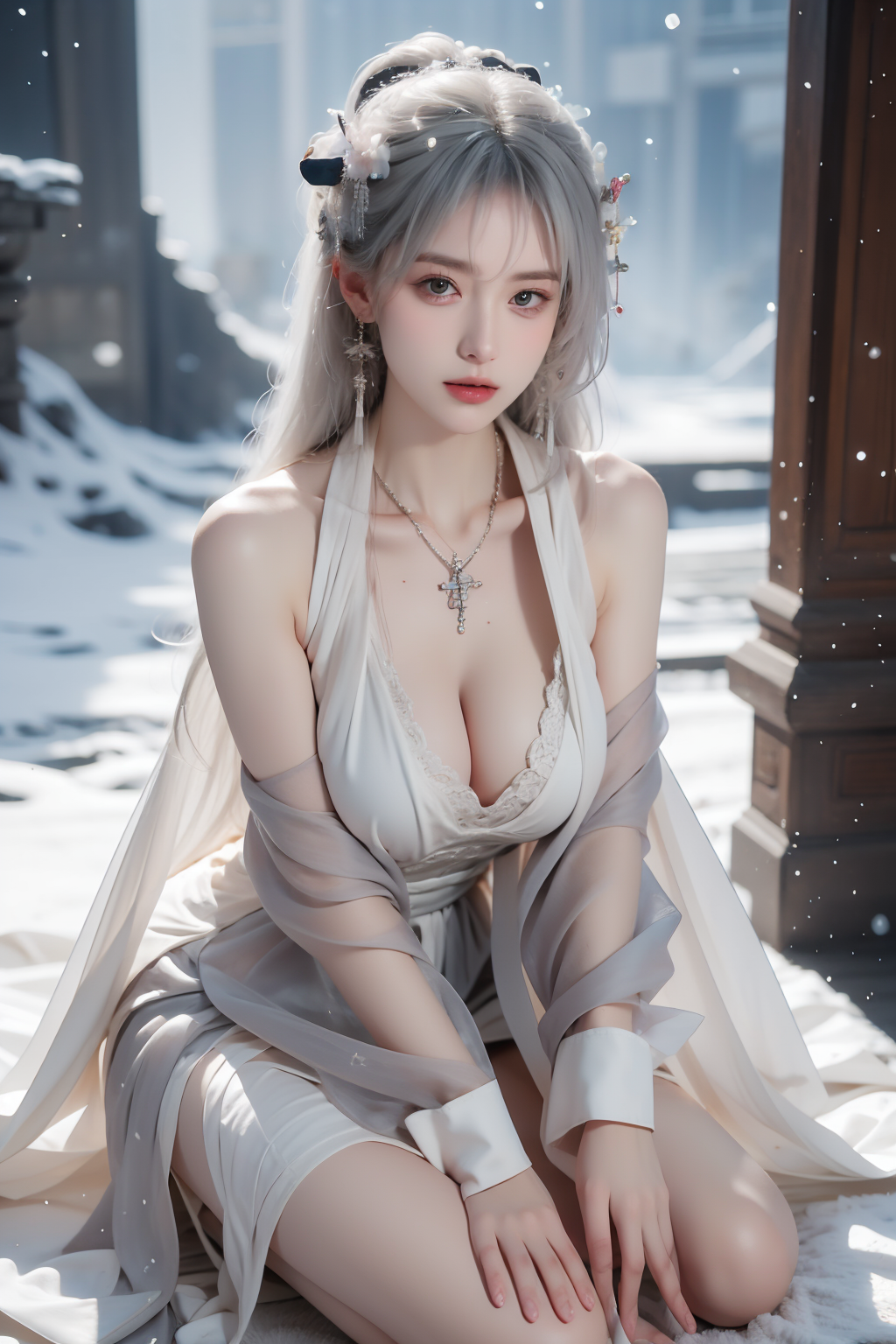 ((best quality)), (real), (masterpiece), absurdres, realistic, 1girl, goddess, very long hair, silver hair, white hairband, large breasts, cleavage, high heels, virgin killer outfit, Perfect face, beautiful face, perfect eyes, beautiful eyes, big chest, crystal earrings, cross necklace, dark suit big scarf, big card, winter, snowy day, Louvre, close-up, sitting