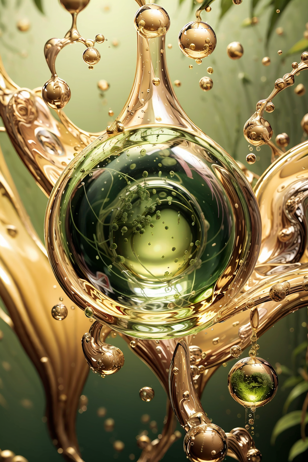 bubble,bottle,It's a very detailed digital AD that features three smooth,transparent glass spheres filled with a variety of natural ingredients. The spheres hang over a vague,lush green background that may depict a forest or garden. The spheres are arranged in a vertical line,with the largest sphere at the top and the smallest at the bottom.,