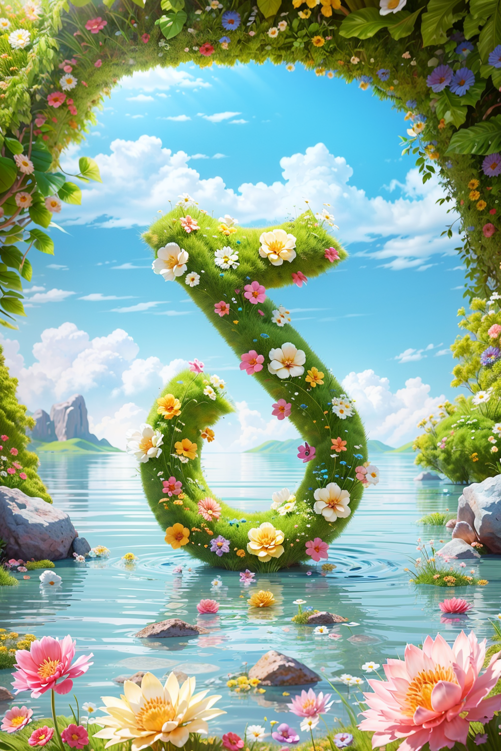 outdoor,blue sky,white clouds,(covered by green grass),on the ground,(flowers:1.3),(rocks covered with grass:1.2),rock cave,(no one),rocks on both sides,grass,water,sea,(beach:1.2),sand,mountains in the distance,pink flowers,yellow flowers,hs,(small grass:1.2),3d render,c4d,8k,masterpiece,super detailed,3d art,oc render,best quality,masterpiece,high resolution,extremely detailed wallpaper,ultra wide angle lens,