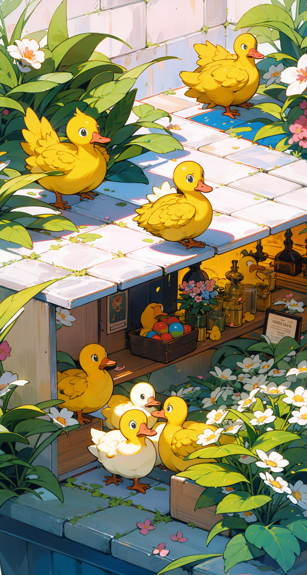 (Best quality), (masterpiece), (detailed details), movie poster, two yellow ducklings, exploring a sunny and mysterious garden. The garden is full of various talking flowers, densely covered with the duck's body, only revealing two cute heads. The duck opens its red beak and smiles, its golden feathers are smooth and soft, glowing creatures, cute and detailed digital art, and anime illustrations,