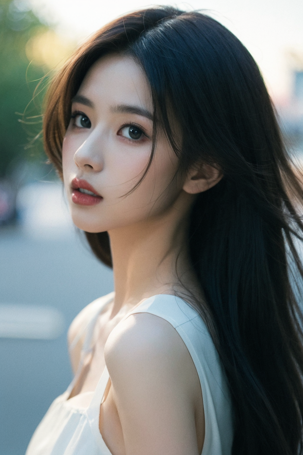 1girl,solo,long hair,realistic,lips,parted lips,upper body,blurry background,floating petals,jitome,cute,short hair