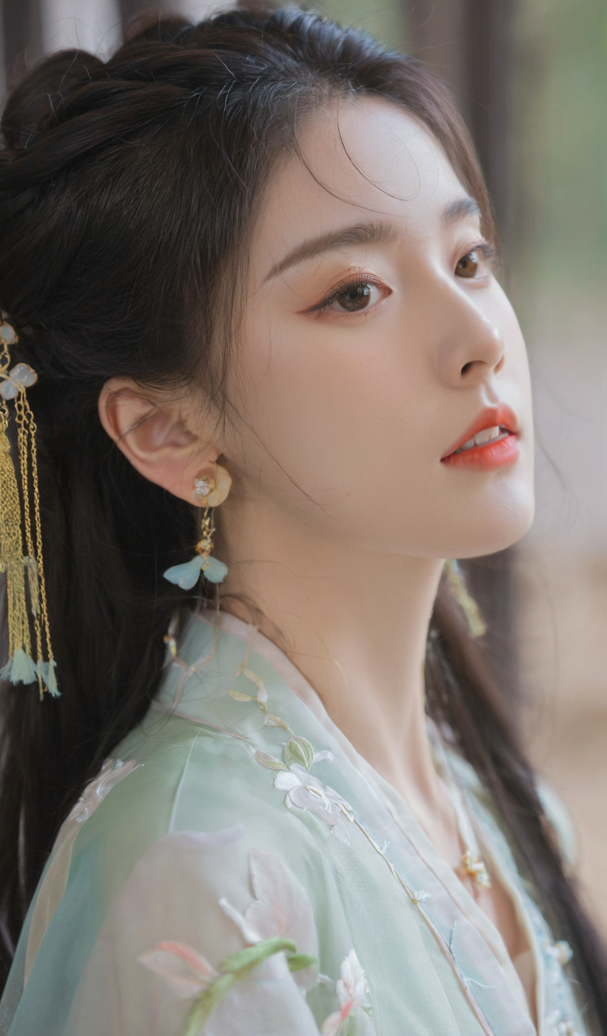 leogirl, seductive leaning forward detailed skin,creamy skin, ultra realistic 8k cg, picture-perfect face, flawless, clean, masterpiece, professional artwork, famous artwork, cinematic lighting, cinematic bloom,(1girl, beautiful girl),perfect face, (young:1.1),((fit figure)),((25 year old)), beautiful face, beautiful eyes,detail eyes, detail face, (((perfect female body, ))),(large breasts:1.1),(girl,Bun, Hairpin,Delicate Eyes, Tassel Earrings, Necklaces, Bracelets, Hanfu, Su Embroidered Hanfu, Streamers, Ribbons, Elegant Stand Posture, Aesthetics, Ray Tracing, Depth of Field, Layering,Fluttering, Hanfu, qingsha),