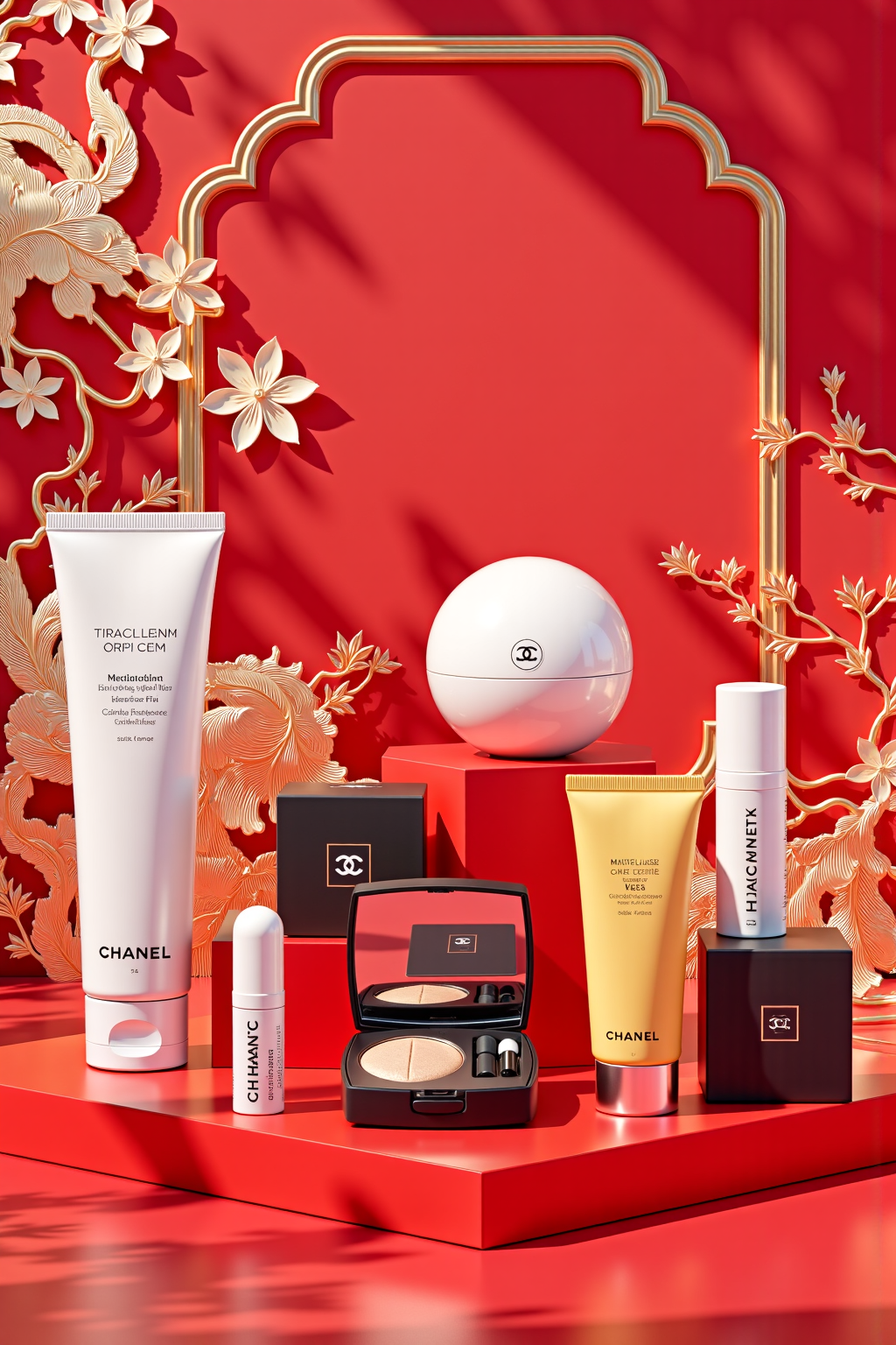 This is a high-resolution photo featuring a luxurious and stylized display of beauty products,with a bright red background and gold and silver decorative elements as the background.,