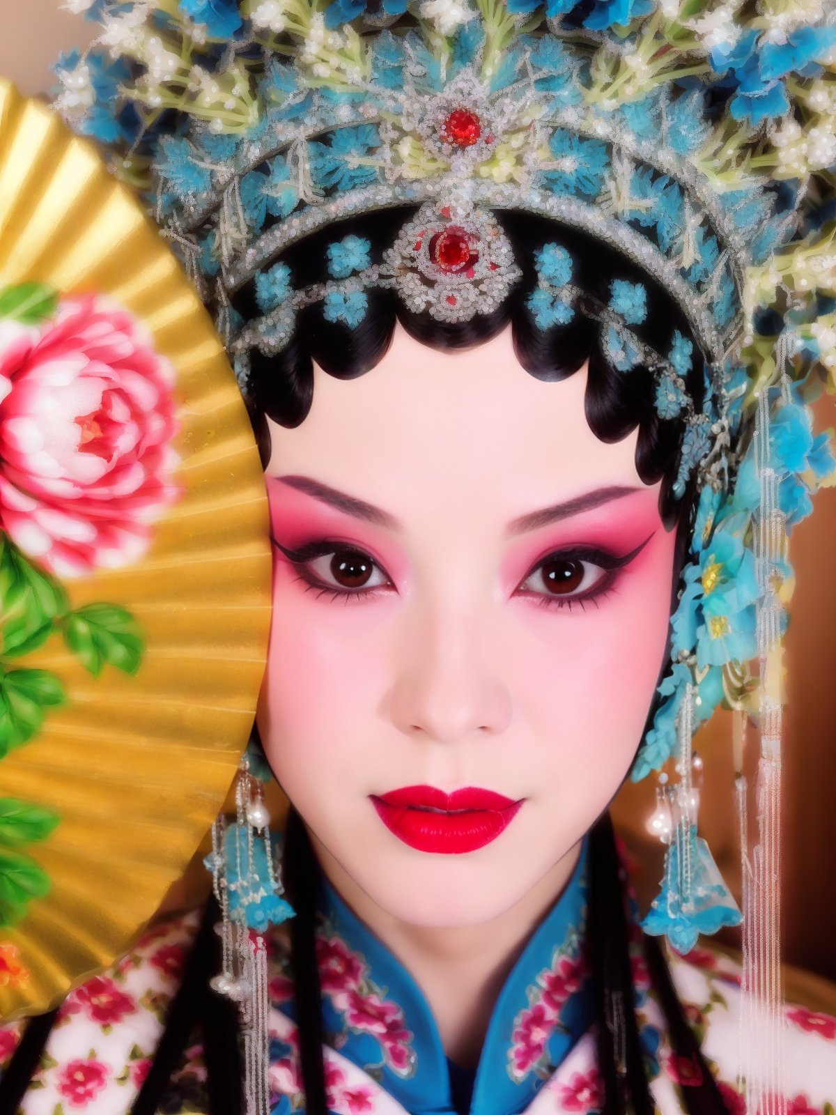 1girl,solo,flower,makeup,black hair,hair ornament,hand fan,black eyes,lipstick,red lips,eyeshadow,hair flower,folding fan,portrait,closed mouth,looking at viewer,huge filesize,wallpaper,Cinematic Lighting,<lora:真实人像—戏曲服饰V1:0.8>,beautiful body,(sexy:1.2),detail face,(best quality,realistic,masterpiece,soft focus,high quality,highly detail:1.1),(portrait:1.2),opal render,dreamlike,floral print,