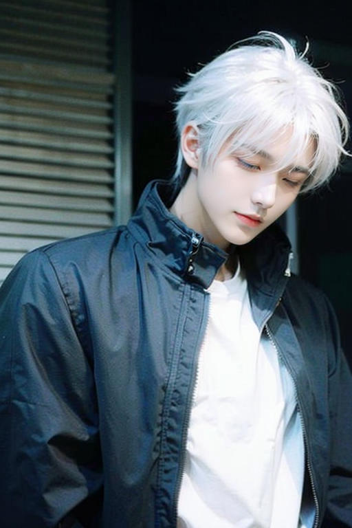 male focus, 1boy, solo, white hair, realistic, upper body, gojou satoru, jacket, blue eyes, long sleeves, black jacket, high collar, bangs, closed mouth, short hair, looking down, holding, half-closed eyes