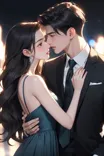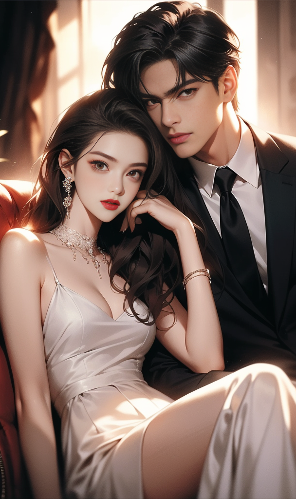 masterpiece,best quality,a couple of people sitting next to each other in a room with a black background and a white dress,