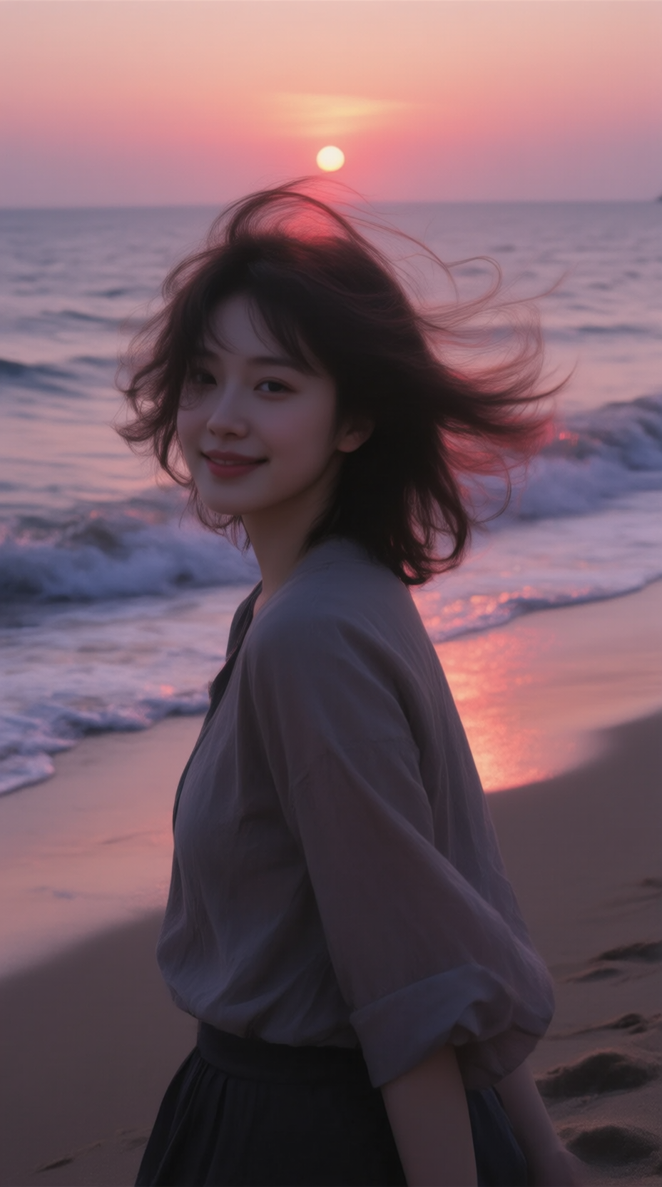 Career line,风中回眸半身,惊艳容貌,蓬松刘海在海风中飘动,动态模糊和发丝分离如落日余晖,嘴角上扬带生活热爱,侧身正面照,暗调转化为沙滩落日氛围,有沙滩夕阳余晖,海浪拍打,超现实主义与印象派融合,细节有沙滩质感,海浪波纹,落日色彩描绘,色彩以红粉紫为主,淡彩且温暖,低光氛围浪漫温馨宁静,个性视角非对称,对焦人物主体,周边虚焦暗朦过曝模拟沙滩光影交错,景深,高噪点,强烈胶片颗粒质感,层次丰富,暗角是无垠大海,写意,光的美学,概念艺术,超现实,高级感,富士胶片,杰作,曝光感,