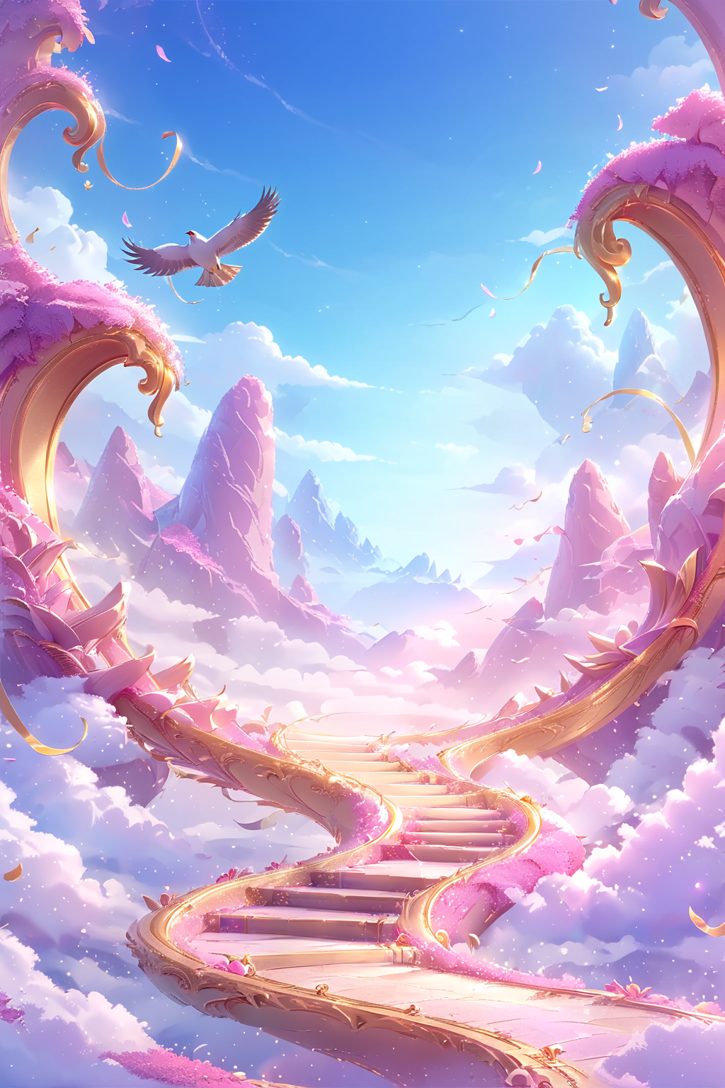 The ground is a staircase **** of books, with an ancient Chinese figure walking on it. fantasy scene, It has exquisite details, colorful light effects, a strong sense of perspective, golden curves, fantasy colors, golden texture, and gorgeous patterns, High-definition poster design rendered with Unreal Engine in the style of a movie-level poster.Bird's eye view, aerial photography, miniature landscape, panoramic photography,with an overall composition of golden streamers and flying particles in the style of C4D software