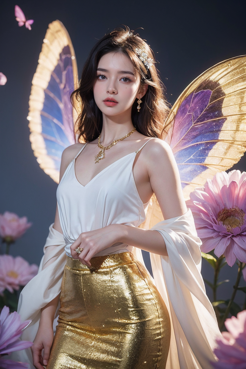 solo,(pure girl:1.1),stars in the eyes,standing,golden gauze skirt,flowers cluster around,There are many scattered luminous petals,gold powder,fashion photography,butterfly,purple gem accessories,flower,model pose,exquisite jewelry,cinematic angle,depth_of_field,artistic photography,extremely beautiful skin,(Milky skin:1.2),dreamy atmosphere,contour deepening,fairy tale style,absurdres,realistic,<lora:梦幻:1>,medium gray adjustment,cowboy_shot,