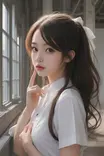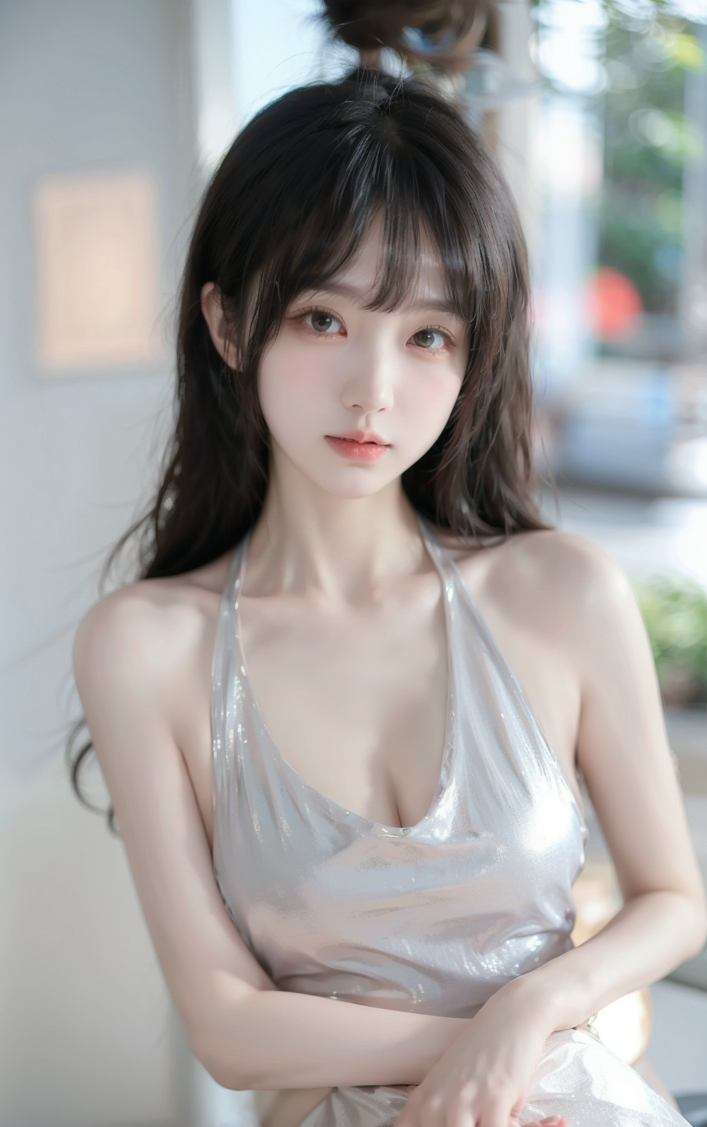 1gril,realistic,best quality,looking_at_viewer,(medium breasts:1.4),(defocus:1.2),bokeh,suneate,stance,cleavage,upper_body,sky,tanono,