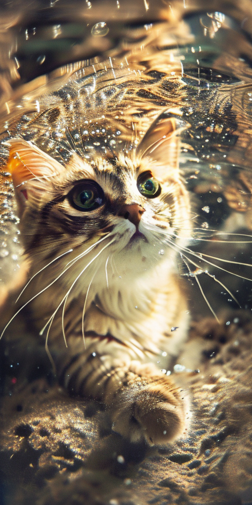 Underwater,blurry,Realistic,cat,full body,swimming,no humans,Animal Focus,Dynamic Angle,Perspective,