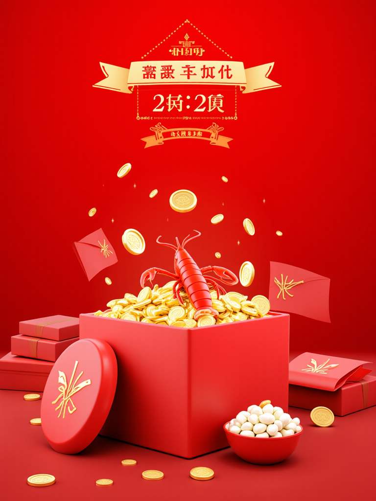 NHJ,New Year's Day Poster,NHJ,New Year's Day Poster,A vibrant,high-quality digital illustration with a Chinese New Year theme. The background is a deep red with gold accents. At the center,there's a large,open red gift box filled with golden coins,a red lobster,and a bowl of white nuts. Surrounding the box are red envelopes and gold coins. The top features a banner with Chinese characters in gold,and the entire composition follows the rule of thirds. The lighting is bright and artificial,emphasizing the festive colors. The depth of field is shallow,with the background slightly blurred.,