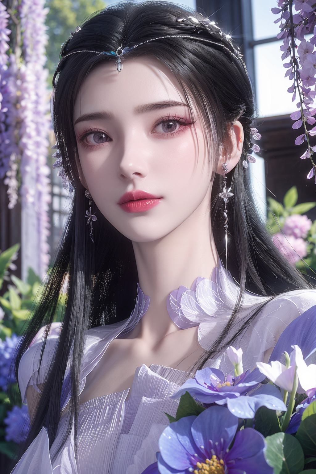 1girl, blurry, bouquet, breasts, cleavage, depth of field, dress, earrings, fingernails, flower, holding, hydrangea, jewelry, long hair, looking at viewer, makeup, nail polish, purple eyes, purple flower, purple hair, purple nails, solo, wisteria <lora:dingdang-limuwanxfxv2:0.8>