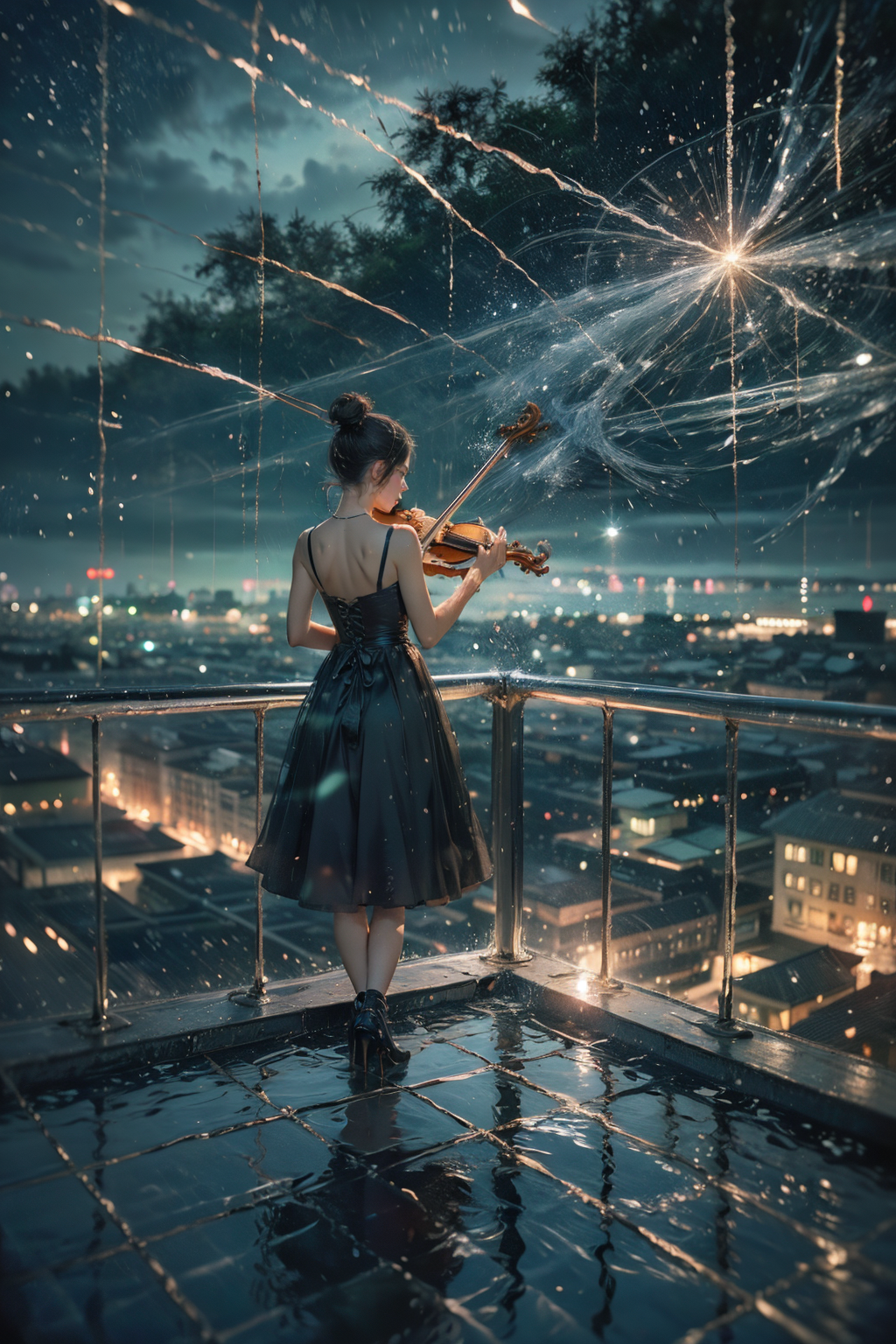 1girl,violin,dress,solo,instrument,black dress,night,music,playing instrument,bow (music),sky,holding instrument,sleeveless dress,holding,standing,night sky,black hair,outdoors,cityscape,sleeveless,black footwear,hair bun,blurry,from behind,high heels,reflection,rooftop,short hair,single hair bun,scenery,railing,city lights,bare shoulders,star (sky),