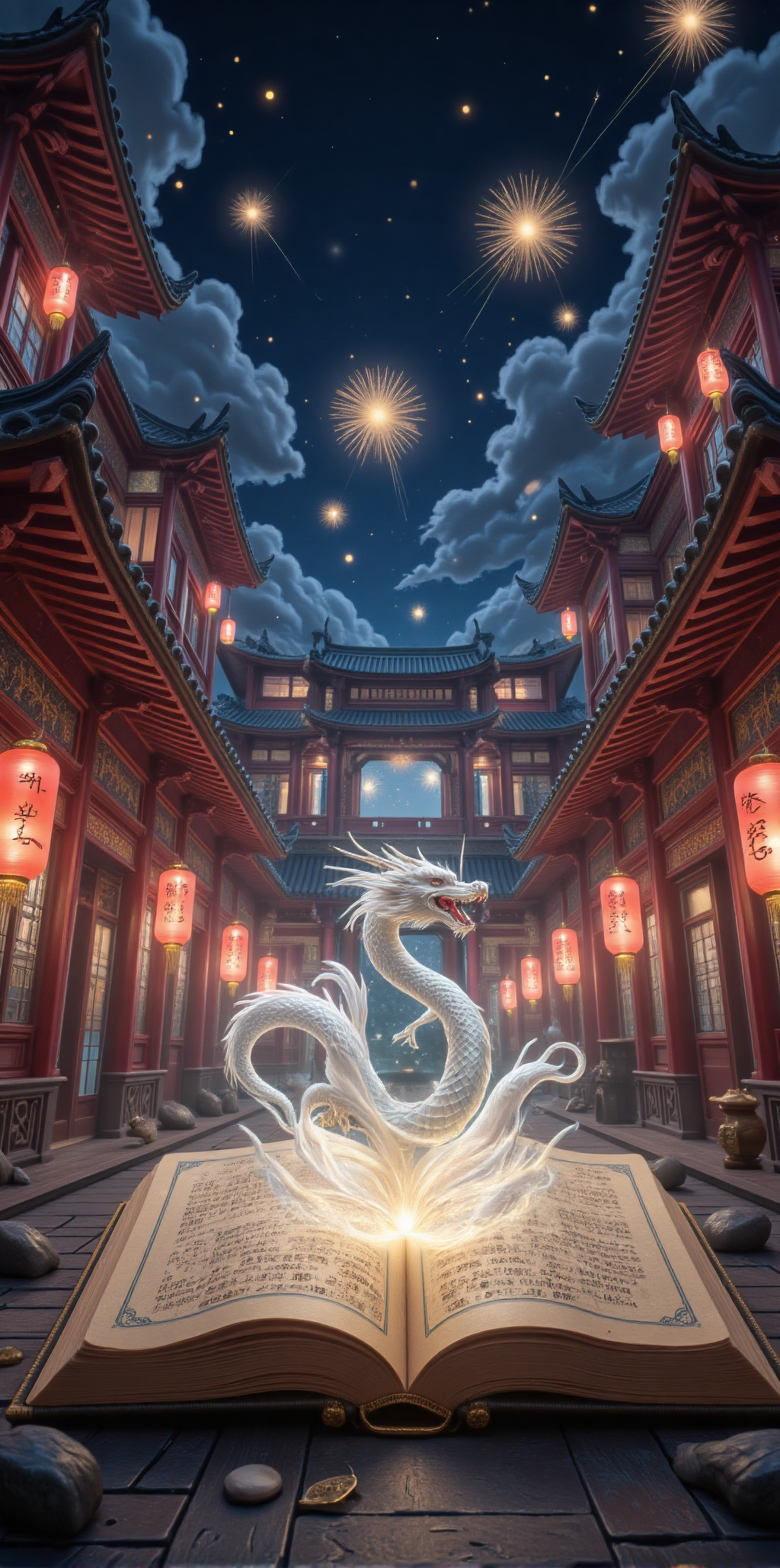 在打开的书的中心出现了一个生机勃勃的夜景,华丽的红顶建筑屋檐下挂着无数红灯笼,将夜色照亮。天空是深蓝色的,点缀着金色的烟花在头顶炸开,增添了节日的喜庆感。