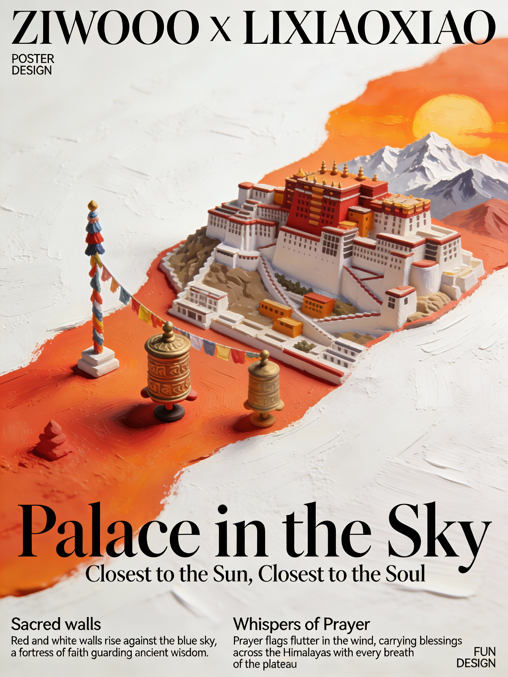 油画风格,学院派的版式设计海报,有着大师级排版的文字设计,3D,微景观,厚涂,厚薄不同塑造立体感,居中斜构图的一抹不规则的暖色橙红, 如同高原的日落,暖色橙红上是拉萨布达拉宫的相关元素(高耸的红白宫殿、经幡、转经筒、远处的雪山和夕阳余晖),极简俯视图, 大面积留白,白色纹理纸质背景。主标题:“Palace in the Sky", 艺术字体, 非常醒目。副标题:“Closest to the Sun, Closest to the Soul"和主题配合,大师级排版。装饰性文案:“Sacred walls”"Red and white walls rise against the blue sky, a fortress of faith guarding ancient wisdom.""Whispers of Prayer""Prayer flags flutter in the wind, carrying blessings across the Himalayas with every breath of the plateau". 左上角小字:“POSTER DESIGN”右下角极小字:“FUN DESIGN”文案皆为衬线体, 装饰性文案分段整合,配合标题进行大师级排版。顶部显示超大字 非衬线字体“ZIWOOO X LIXIAOXIAO