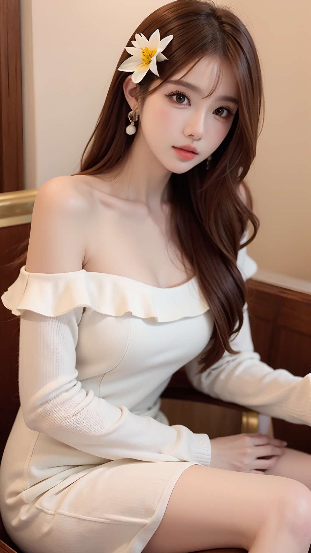 1girl,bare shoulders,breasts,cup,depth of field,flower,hair flower,hair ornament,lily \(flower\),lips,off shoulder,solo,white flower,<lora:capricornus-V25:0.8>