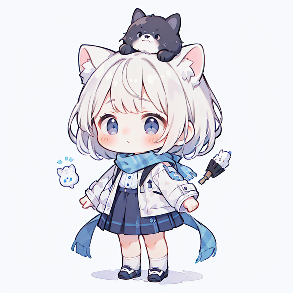 A girl with white hair,short hair,(black coat),blue scarf,blue glasses,((white shirt)),blue plaid skirt,white socks,black sports shoes,Qi Liu Hai,with white animal ears on his head,Beast ears grow on the head,The skirt is blue,and the coat is black,