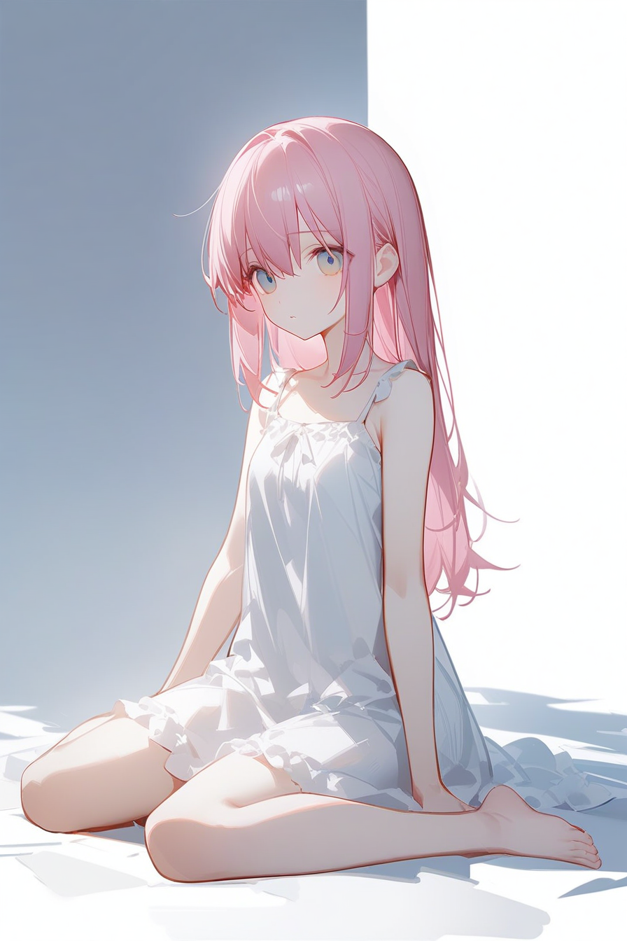 (ask(askzy):1.5),masterpiece,bestquality,1girl,gotoh hitori,bocchi the rock,pink hair,bule eyes,white_nightgown,full_body,wariza,(white_background:1.3),(NAI3:1.7),