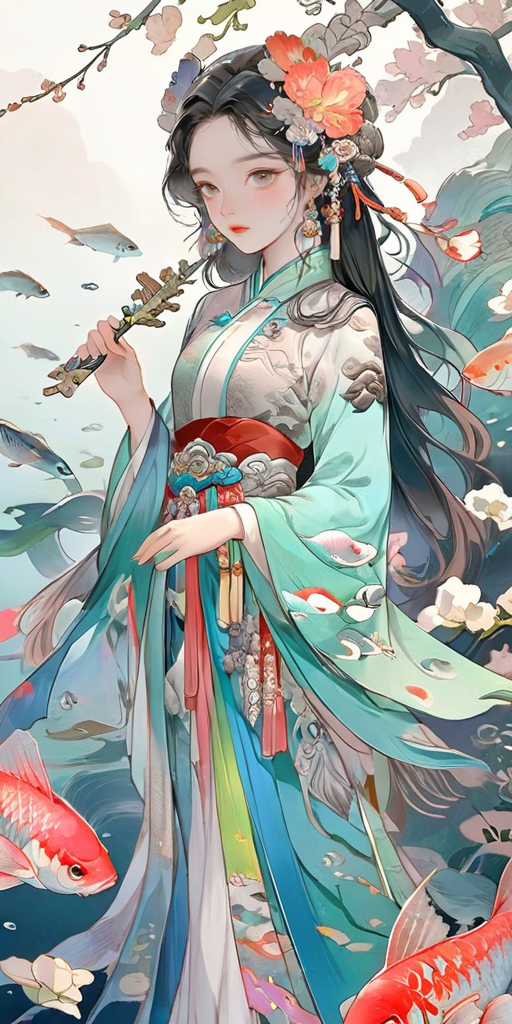 guofeng,Illustrated,1girl,black eyes,long hair,super precise depiction,(flowers),multiple colors,high definition,Rich in intricate details. 8K,illustration,crazy colors,tress,(full body:2),wide shot,fish,