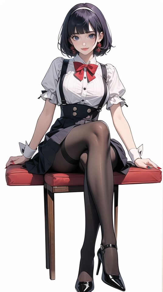(best quality), ((masterpiece)), (highres), illustration, original, extremely detailed, 1girl, solo, black rose, shidare hotaru, black flower, flower, rose, pantyhose, breasts, hair flower, skirt, red bow, blue eyes, large breasts, hair ornament, thighband pantyhose, sitting, purple hair, hairband, suspenders, stool, nail polish, red bowtie, high heels, bow, frills, suspender skirt, bangs, crossed legs, red nails, high-waist skirt, ribbon, short hair, looking at viewer, short sleeves, full body, smile, shirt, black pantyhose, black skirt, simple background, wrist cuffs, white background, bowtie, white shirt, frilled sleeves, closed mouth, white footwear, sidelocks, puffy sleeves, hair ribbon, blunt bangs, ringed eyes, buttons