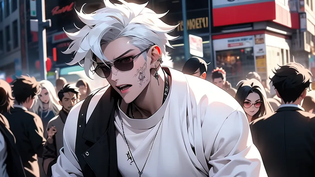 8k, c4d, An old man, white hair, bad guy, rascal, triangular eyes, Wearing a white vest, in the streets of the city, striding