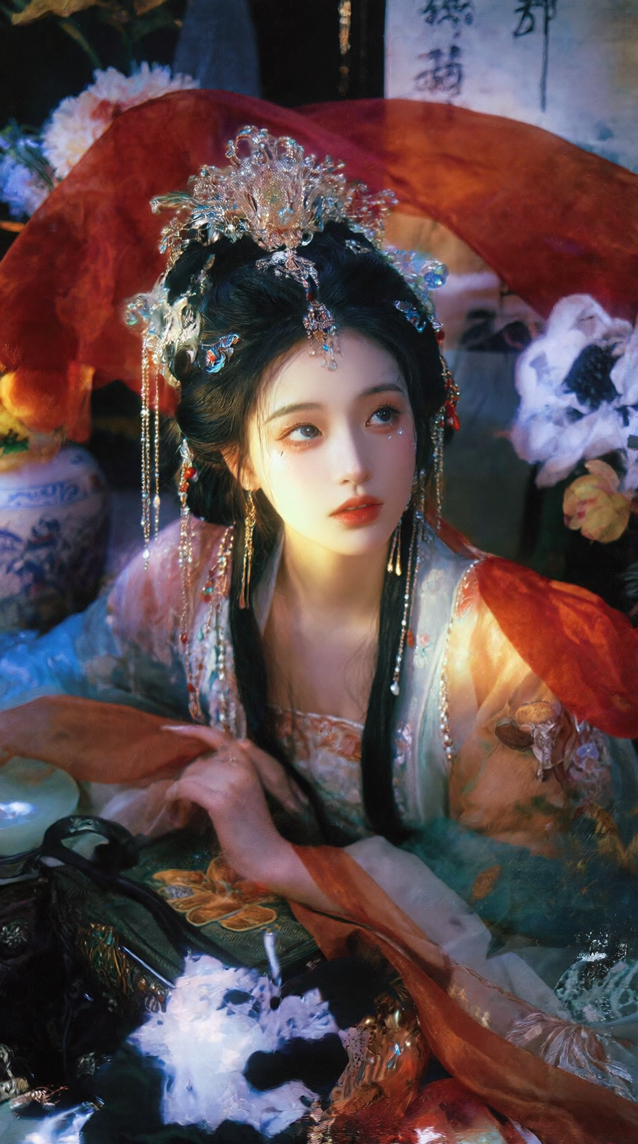 写真风格图片风格,色彩丰富,油画肌理,精致的细节。,营造出充满故事感且带着清冷大小姐氛围的画面,打造出画面的颗粒感和肌理感,展现 超古风主义美学 的高级氛围感与层次感。光感朦胧,利用晕染、叠涂、弥散渐变技法,让色彩饱满层次丰富。脸部特写,华丽繁杂精致的造型发饰,流苏,华丽的霞帔发饰,周围有红绸,书画等古风物品,同时有极度精致繁华的花卉插入其中,是一幅极具奇幻色彩的国风画面。最具艺术感的主光源,塑造强烈的立体感、质感与戏剧性明暗对比必须优化构图。突出唯一主体,并遵循三分法、引导线或负空间等经典构图原则,创造呼吸感与叙事张力。将画面细节提升到摄影级/超写实级。极致渲染关键材质的纹理、反光与透光性。根据图像主题,生成一个和谐且富有情绪的色彩分级,营造出独特的氛围。8K分辨率,超真实,具有惊人的细节与艺术感染力,表情要丰富,尤其是眼睛与嘴巴,尽可能甜美,除非环境与造型不允许。拍照视角也可以多样化,不拘一格