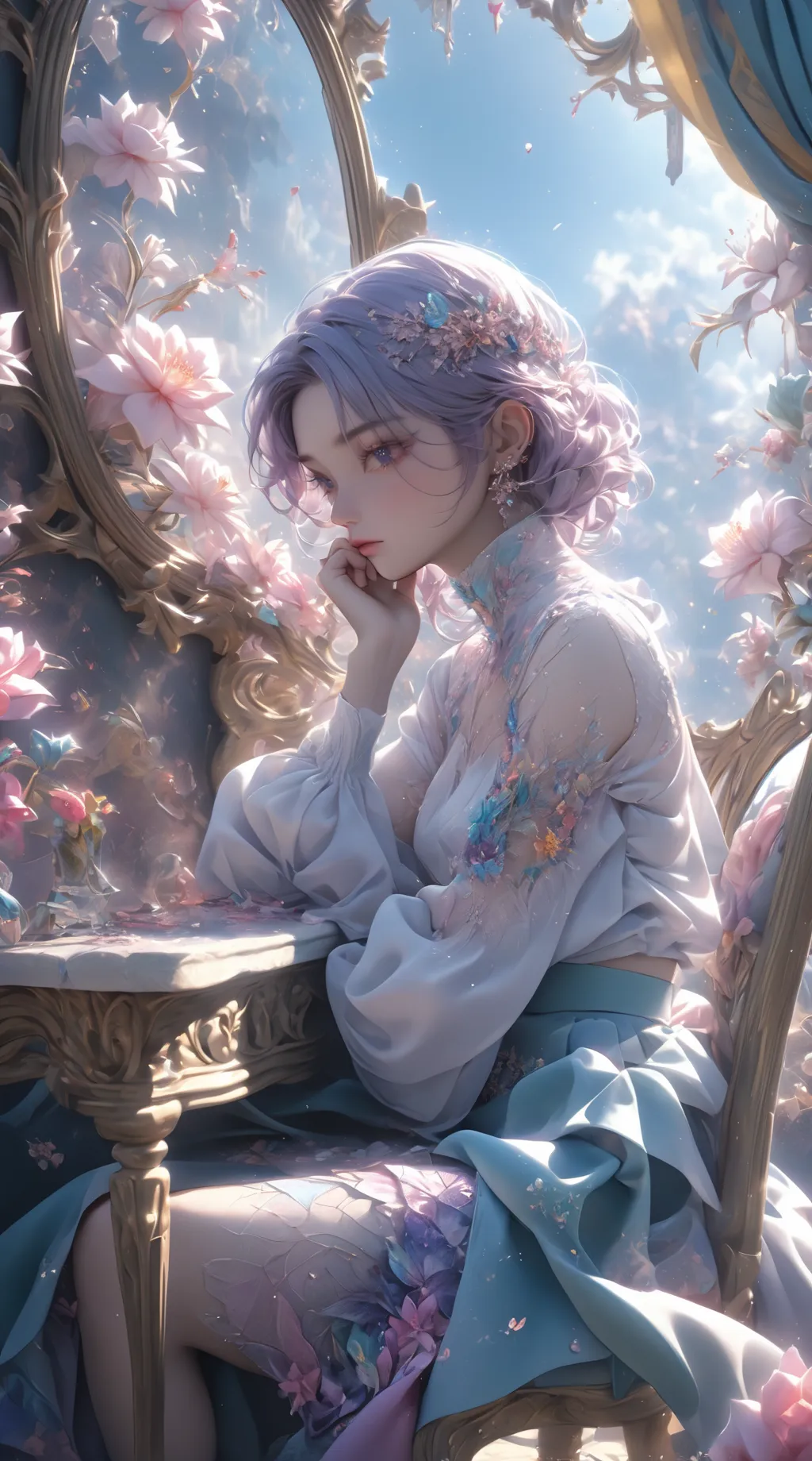 1girl Sitting on a chair,broken mirror,(masterpiece, top quality, best quality, official art, beautiful and aesthetic:1.2), (1girl), extreme detailed,flowers,(fractal art:1.3),colorful,highest detailed,Real photos, real photography, (real skin texture),(realistic)