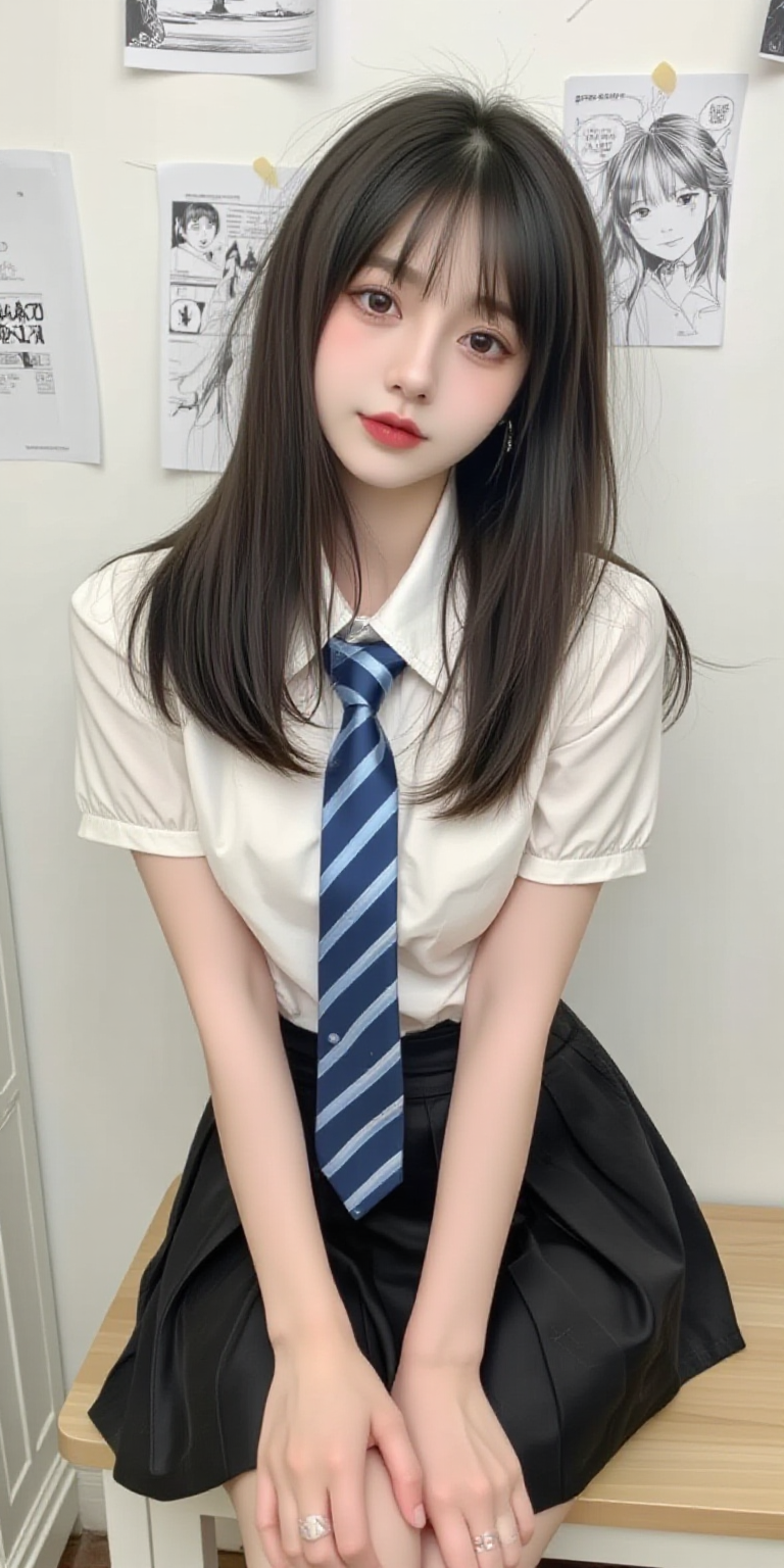 This is a clear mobile selfie photo with a daily style. In the picture,there is a woman wearing a white short-sleeved shirt and a black pleated skirt,with a blue and white striped tie. She has long black hair,sitting on a wooden chair with her hands resting on her knees,facing the camera,and her eyes are looking at the camera. She appears to be around 20 years old,slim,and her expression is calm. Her outfit consists of a white short-sleeved shirt,a blue and white striped tie,and a black pleated skirt. Her hair is flowing freely without bangs. The background is a white wall,hanging some black and white comics.,