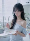 A pretty chinese brown long hair small breasts 20-years old idol girl wearing yoga underwear sitting on platform at the back of the yacht,Many beautiful cliff islands in the distance,