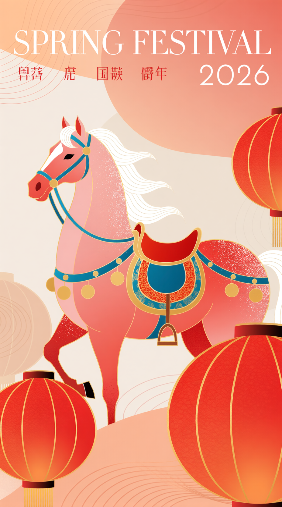 A festive Chinese New Year poster illustration for the Year of the Horse 2026. A stylized,elegant pink and reddish horse with a flowing white mane is the main subject,wearing a decorative traditional Chinese saddle and harness with blue and gold accents. The horse is surrounded by large,textured red paper lanterns in the foreground. The background is a soft gradient of peach,beige,and light orange with subtle abstract swirling line patterns. The image features a modern graphic design style with a grainy noise texture,vibrant warm colors,and elegant typography layout. Top text reads "SPRING FESTIVAL". High quality,artistic,celebration atmosphere.,