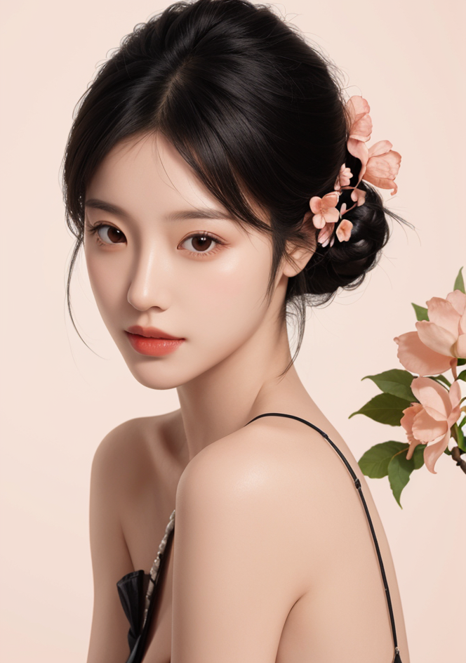 1girl,solo,black hair,realistic,lips,masterpiece,best quality,Solid background,skin texture,peach blossom,.