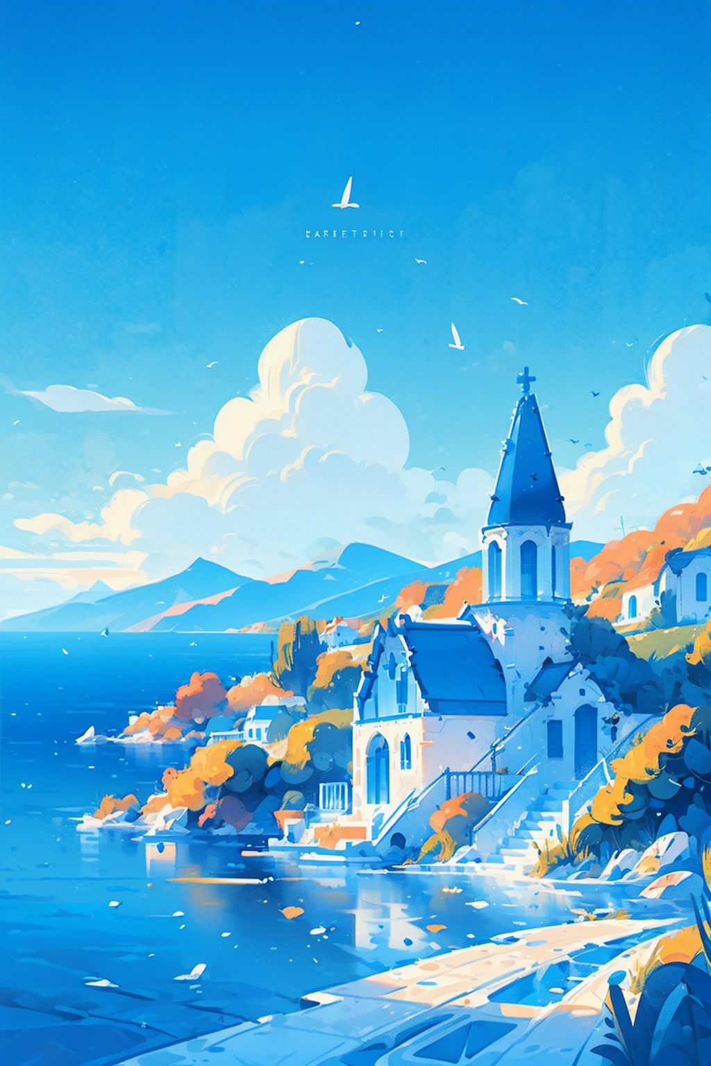 (masterpiece, top quality, best quality, photorealistic, official art,scenery, watercraft, outdoors, no humans, boat, sky, cloud, day, bird, ocean, building, blue sky, water, english text, blue theme,