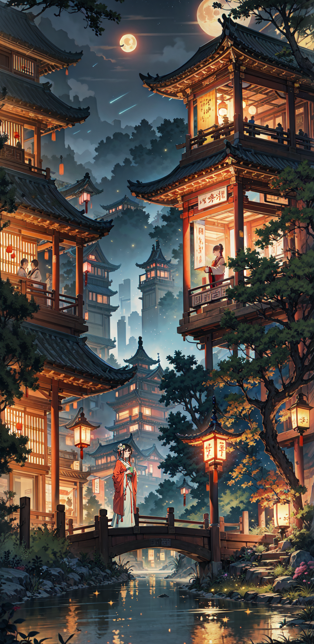 1girl,chinese clothes, hanfu,lantern,city, East Asian architecture,garden,street,building on mountain,light particles,firefly,night:1.5,moon,star,river, nature,neon lights,cyberpunk,outdoors,(Masterpiece, best quality, very detailed CG, complex details: 1.2), <lora:Xiaorenshu_v20:0.5>.