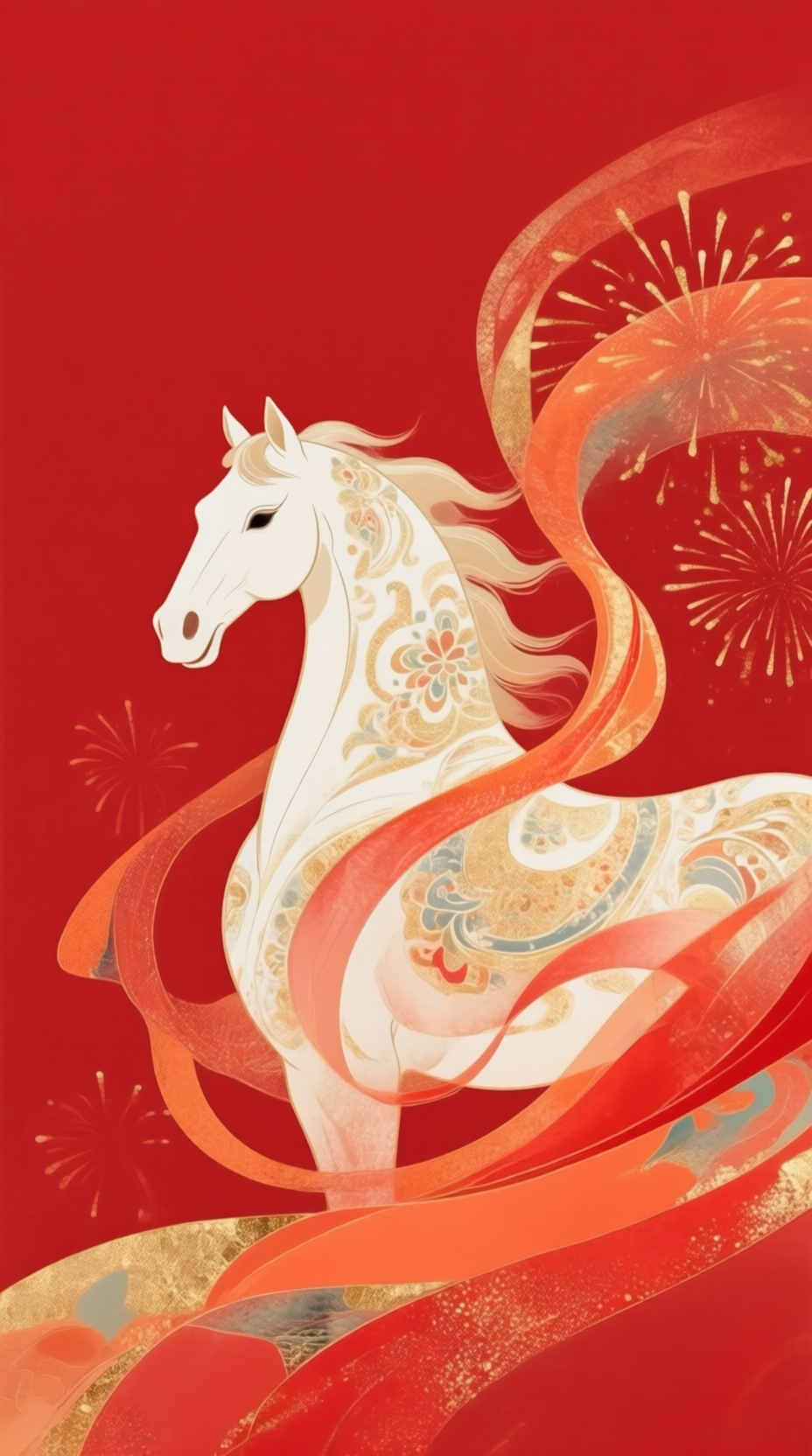 Chinese Zodiac Horse,majestic white stallion with traditional ornate decorative patterns on its body,flowing long silk ribbons in vibrant red and orange swirling around the horse,elegant composition,high-end Chinese aesthetic,minimalist red background,golden fireworks sparks,intricate details,Ukiyo-e and traditional ink wash painting fusion,8k resolution,flat vector illustration style.,Abstract texture,