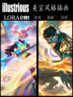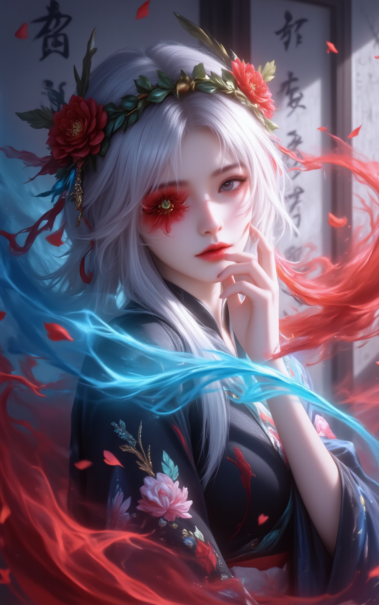 A young Asian woman wearing a floral wreath and Hanfu,this is an expressive acrylic style painting that gives it a dynamic and emotional quality. A woman with a flowing red and blue mist around her body. The mist creates a dramatic and surreal effect. A blooming red flower,covering one eye,attached to the face. This woman has a cold aesthetic,paired with her white hair. In anime art,women are shrouded in shadows,and lighting enhances their unique and sexy characteristics. Wearing a black kimono decorated with flowers. The background is blurry. The background is a wall with Chinese characters written on it,forming a sharp contrast with the ladys clothing. Full of red rose petals.,