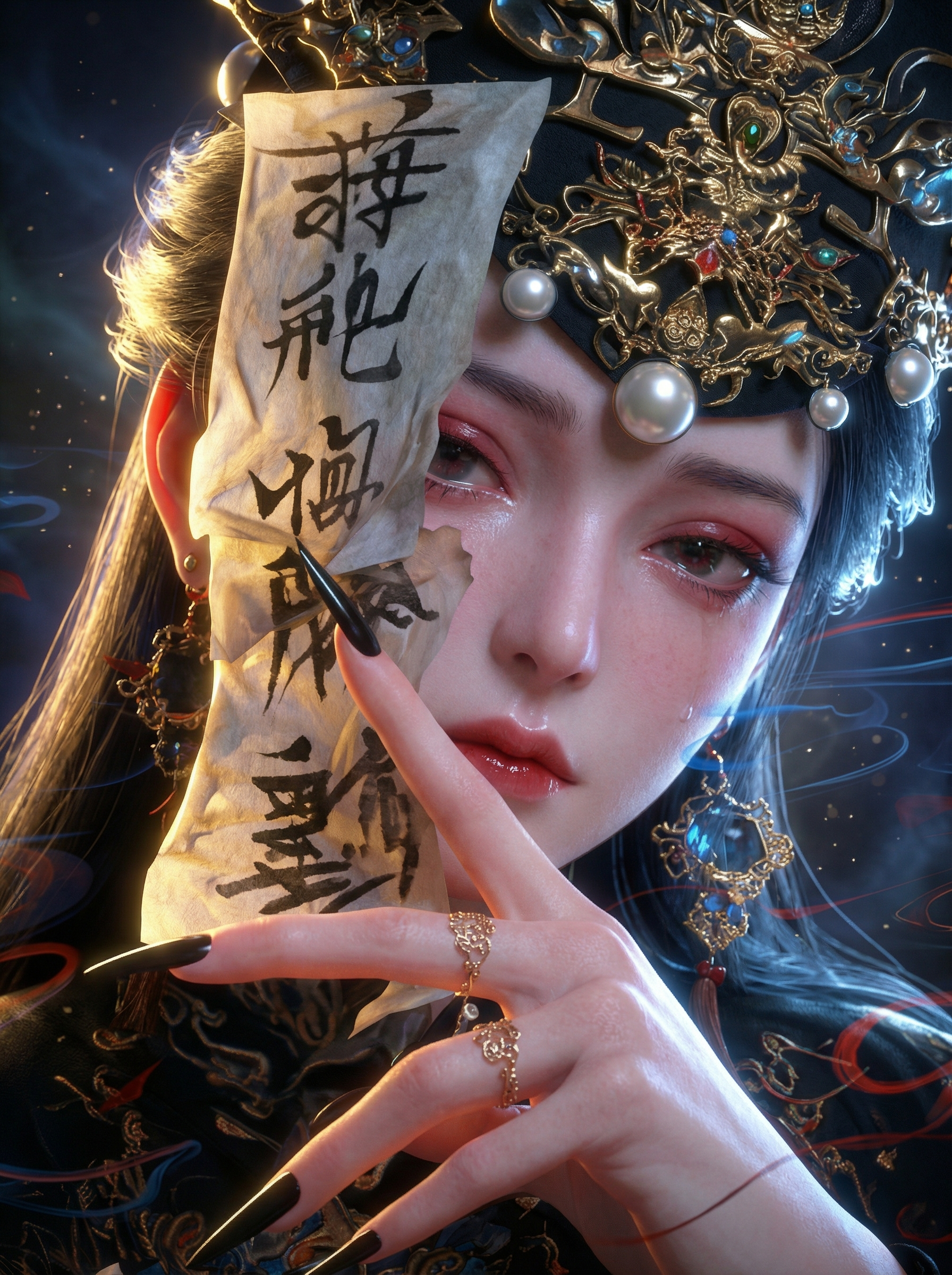 将图片以这种风格进行渲染,高度工业化的次世代3D游戏CG与国风虚拟偶像渲染风格。转人物转为高精度3D超写实角色,背光,曝光,明亮的光线,保持其表情不变。完美融合了东方古典美学(如仙侠、武侠等)与现代光线追踪技术。极致的PBR物理渲染,超真实的材质。真实的皮肤材质,皮肤采用次表面散射(SSS)技术,赋予角色通透细腻红润的真实质感。毛发采用分层渲染每一根发丝都清晰可见且具有自然的动态光泽。提升角色清晰度,超清,特效,光效,明亮的光线,曝光,光感,焦散,发光。保持视角不变,保持透视不变。影视级布光光影,结合体积光、环境光遮蔽(AO)与粒子特效,营造出充满情绪张力和唯美氛围的画面,整体呈现出超越现实的理想化美感。