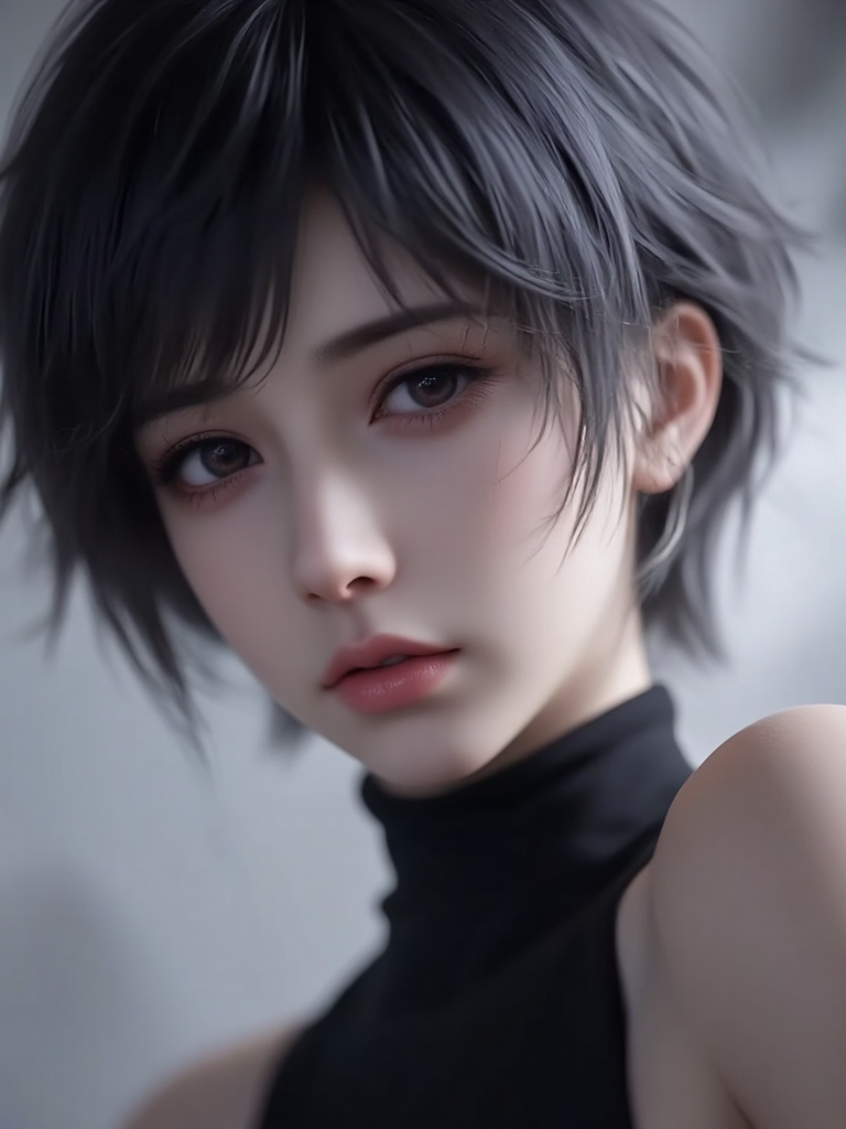 Close-up of a full-body cosplay,a lively and beautiful character of Aiko Amakawa,scene and portrait,short hair,style of Masakazu Katsura,highlighting the messy beauty of dynamic hair,extremely high facial beauty,delicate face,close-up of the face,beautification,gentle,modern,hazy,Rembrandt lighting,low saturation,reflection,refraction,texture,high noise,film grain texture,minimalist style,soft focus gray aesthetic,emotional impressionism,avant-garde visual art aesthetics,high-end cinematic feel,cinematic aesthetics,masterpiece of the master,8k ultra HD quality,cinematic texture,